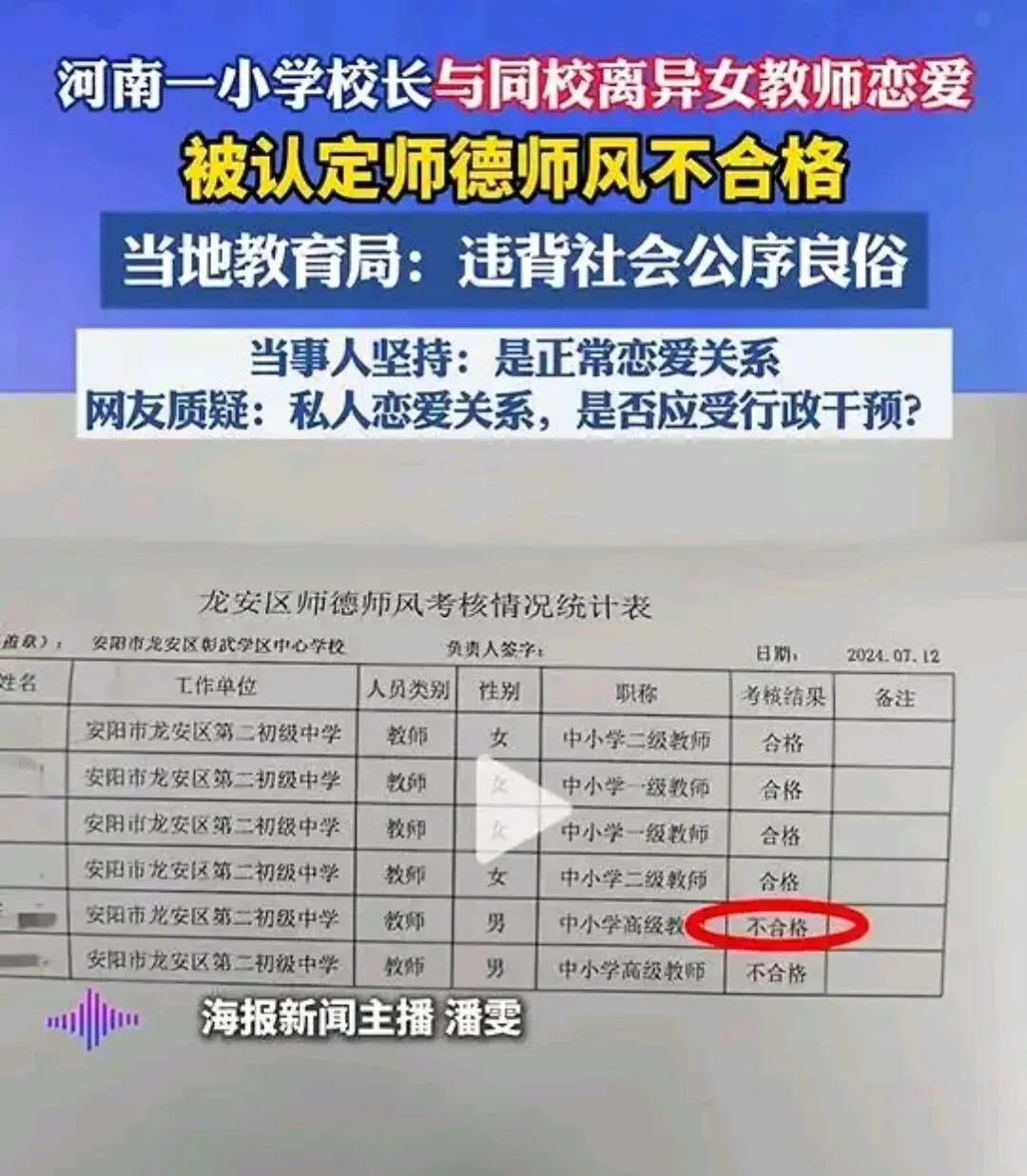 龙安区教育局负责人回应称,陈某的行为"违背社会公序良俗,违反职业道德行为",符合直接认定为师德不合格的范围。但这一认定引发广泛质疑:两个单身成年人的正常恋爱,何以构成"违背公序良俗"?