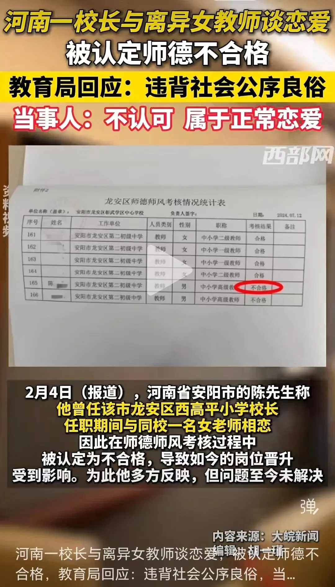 师德师风考核的初衷,是规范教师的职业行为,可慢慢的,这根尺子就歪了:不许穿短裙、不许染头发、不许化浓妆,说是“不符合教师形象”;不许在朋友圈发私人生活、不许和朋友出去聚餐、lv拍照,怕“带坏学生”;就连同事之间正常交往,都要被人指指点点,更别说像这位校长一样,谈一场光明正大的恋爱。