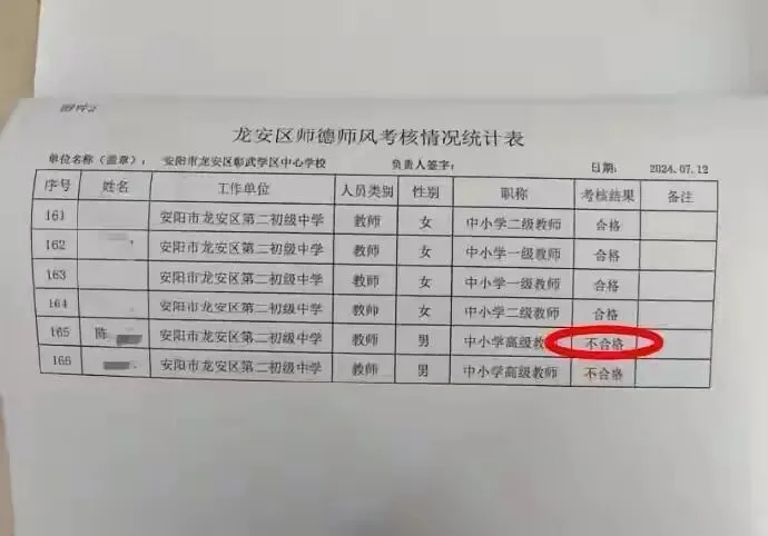 但没想到的是,这事儿还没完。2025年底陈先生准备岗位晋升时,才发现自己的师德师风考核被定为不合格!原来2024年6月,龙安区纪委给了他党内警告处分,说他的行为"严重违反社会公德,违反党的生活纪律"。