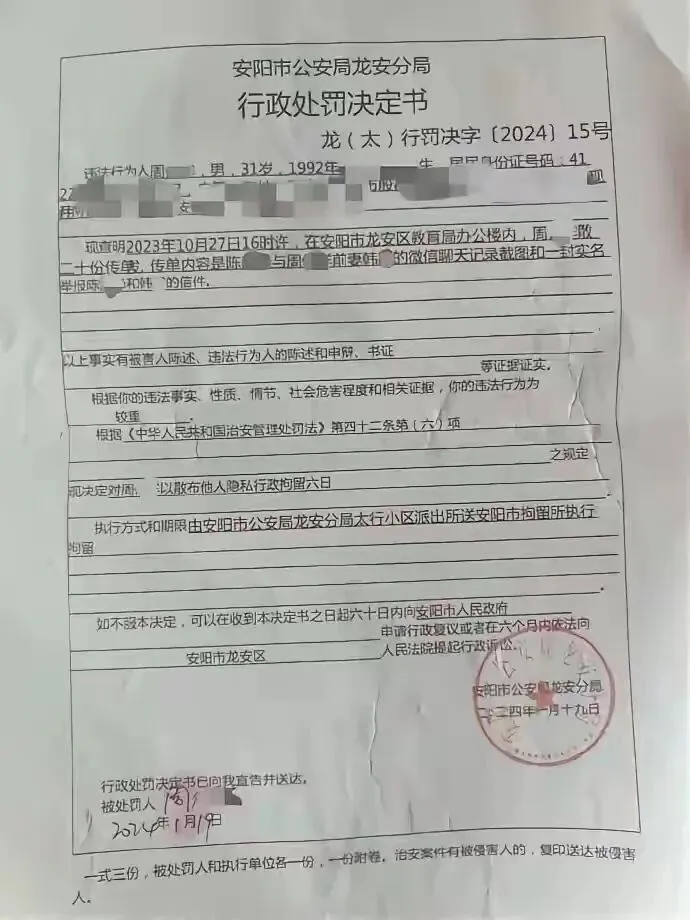 可谁想到,韩某的前夫周某不乐意了,通过窃取前妻手机隐私的方式知道了这事儿,直接在网上发帖举报,还在当地教育局办公区域散发传单!陈先生报警后,周某因散布他人隐私被行政拘留6日,其他传播者也受到了处罚。这明显说明举报内容不实啊!