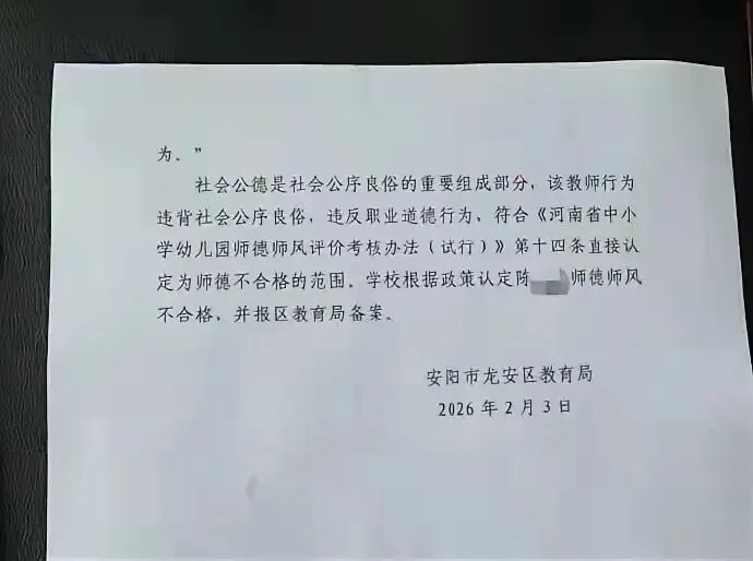 教育局这边给出的解释是,依据《河南省中小学幼儿园师德师风评价考核办法》,他的行为"违背社会公序良俗",所以直接认定为师德不合格。