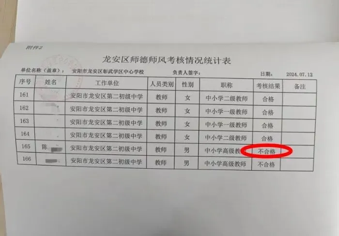 陈先生提供的龙安区彰武学区中心学校于2024年7月出具的师德师风考核情况统计表显示,陈先生的工作单位为龙安区第二初级中学,考核结果为不合格。