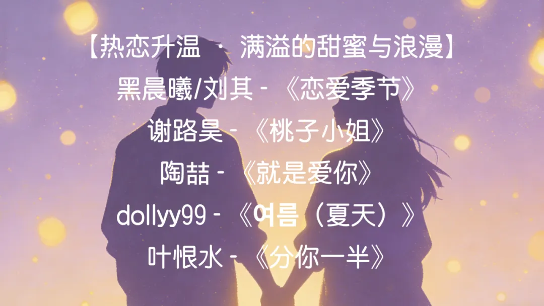 1. 黑晨曦/刘其《恋爱季节》:对唱演绎恋爱的甜蜜,旋律轻快,氛围浪漫。