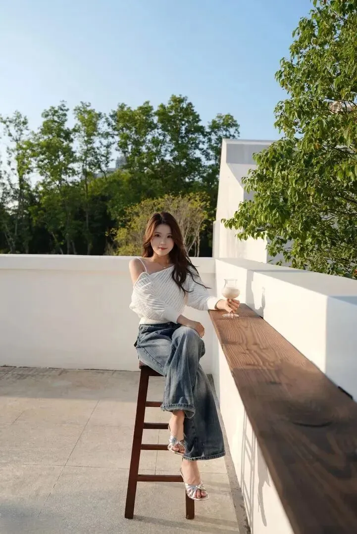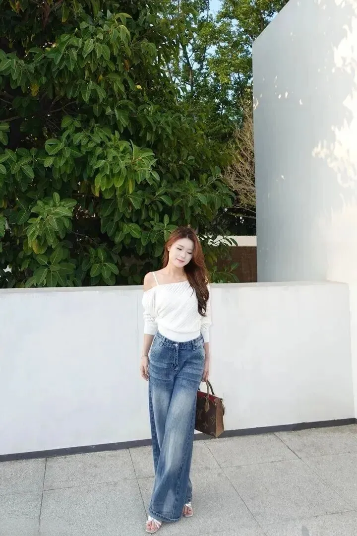 其实秘诀.很简单,就.是一件白.色露肩针织.衫,加.上一.条阔腿牛仔.裤。