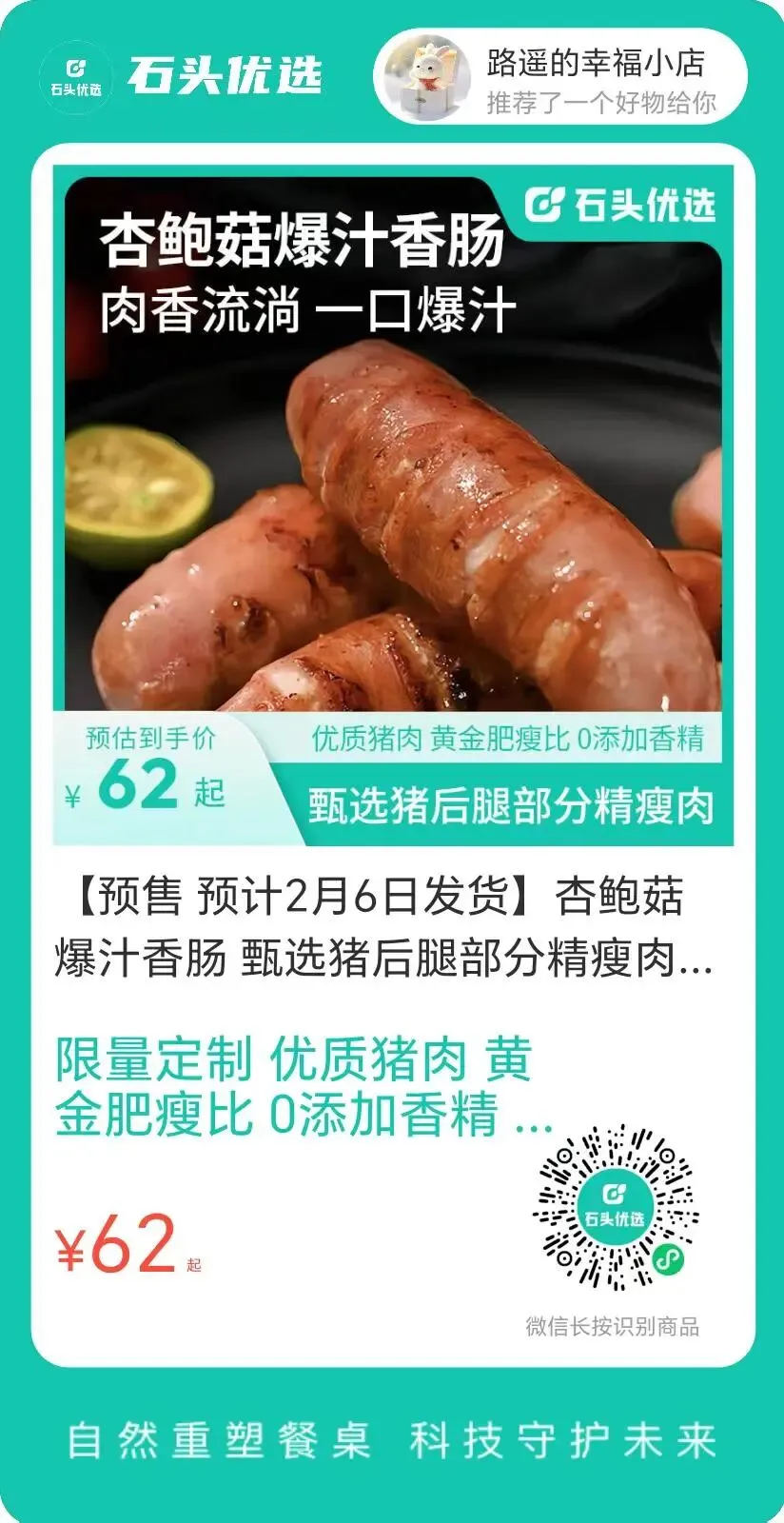 主要是为了打个广告~你没说是什么年货,我就拿石头优选的杏鲍菇香肠和水牛奶来举例,你之后品尝过了可以说:“哥哥真的太懂我了,我超爱吃香肠,就是平时不太会买,你买的不仅有杏鲍菇,里面还会爆汁,天呐。”(文末有购买链接)“你送的水牛奶真的好好喝,是市面上没喝过的味道,特别醇厚,喝起来很甜,感觉都可以用来做甜品了。”夸细节,就是最好的对别人表达感谢,给别人提供正向反馈的方法。以后他就会想继续给你送东西,想持续从你这里得到正反馈