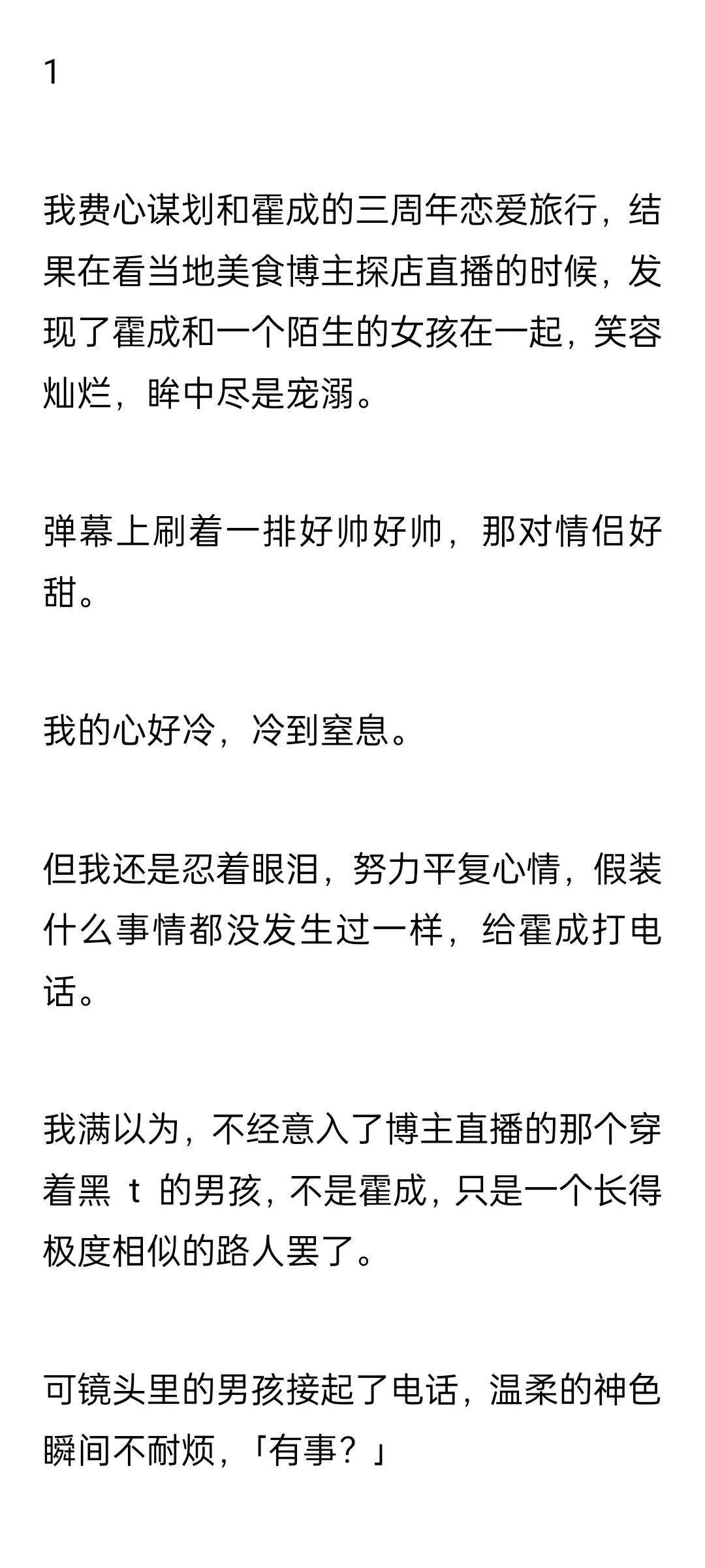 我费心谋划和霍成的三周年恋爱旅行,结果在看当地美食博主探店直播的时候,发现了霍成和一个陌生的女孩在一起,笑容灿烂