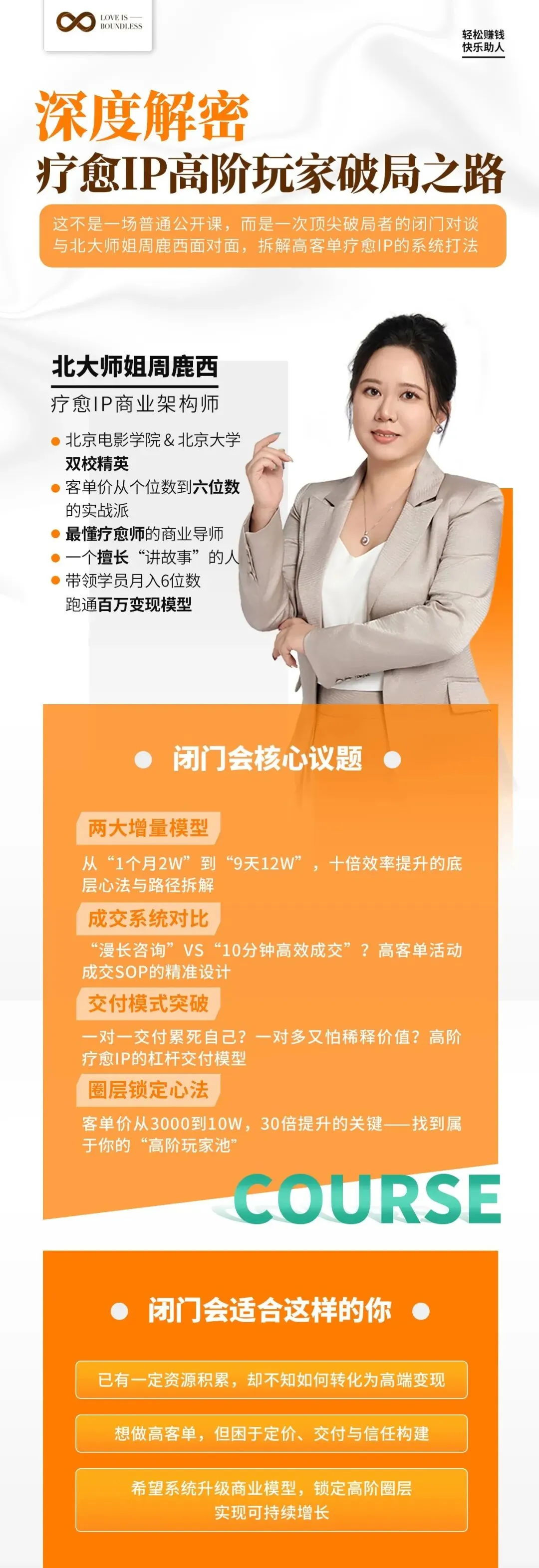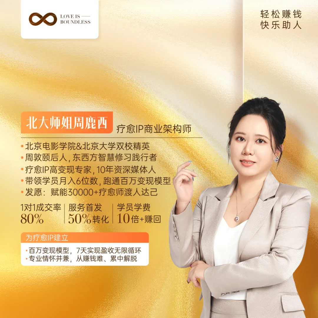我是北大师姐周鹿西,我是疗愈师,也是疗愈IP商业架构师。3年间我个案1000+。把客单价从:“一杯奶茶钱”做到6位数,现在帮助疗愈师学员们建立百万变现模型。