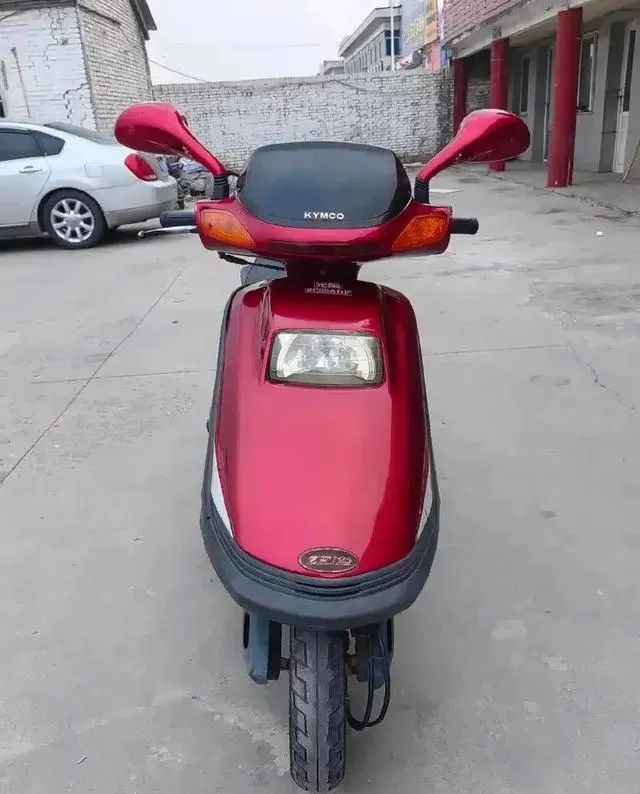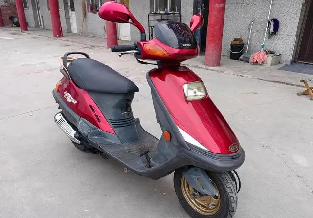 图里这台红色踏板叫光阳豪迈125,外壳油漆红得发亮,前脸是一只方灯,黑色风挡上印着KYMCO字样,脚踏板宽,金色小轮毂配鼓刹,后面还有一根金属行李扶手,样子不夸张,可一启钥匙那股四冲程的嗡嗡声真细腻。