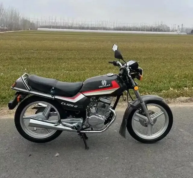 这个黑身子红条纹的叫春兰豹,车架直来直去,前后都是铝合金轮圈,油箱上“CHUNLAN”白字干净利索,方正大灯像一块砖头,坐垫长得能挤仨人不费劲,排气管亮得照人,整体就是一个字,实。