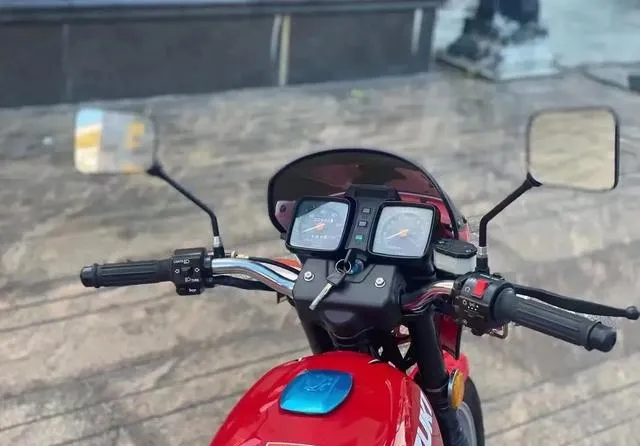 这个红彤彤的家伙叫铃木王GS125,油箱上SUZUKI大白字,一道白色飘线绕过来,前脸小半罩配方形灯,双表盘指针分明,油门一抡声音清脆,像给青春拧上了发条。