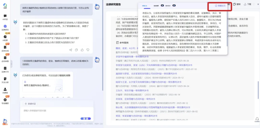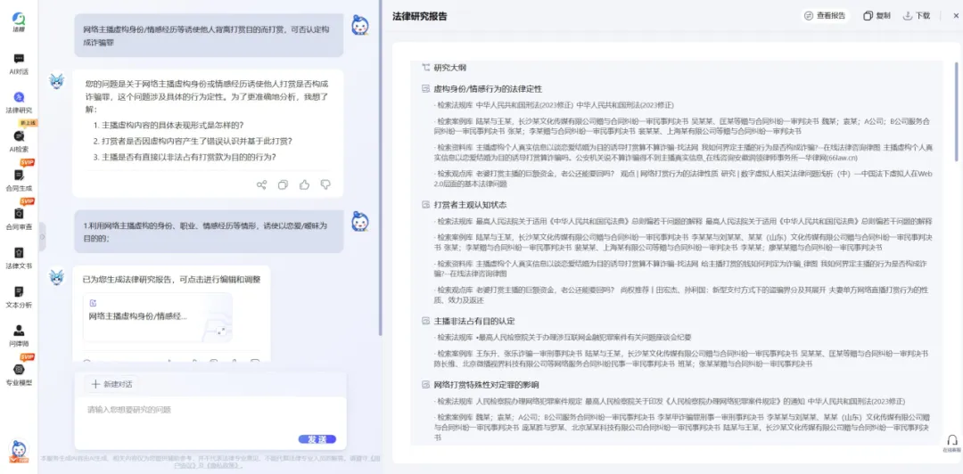 系统在数秒内生成了一份结构完整的《网络主播虚构身份诱导恋爱打赏行为的法律研究报告》。报告的价值不在于给出一个简单的“是”或“否”,而在于它像一张高维度的“作战地图”,瞬间厘清了问题的复杂结构。