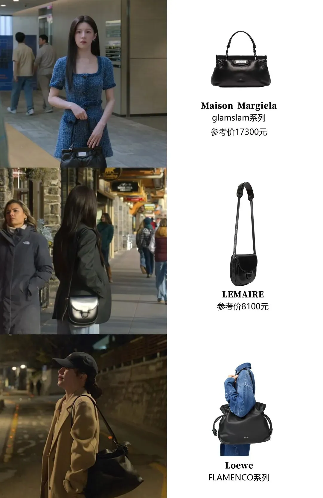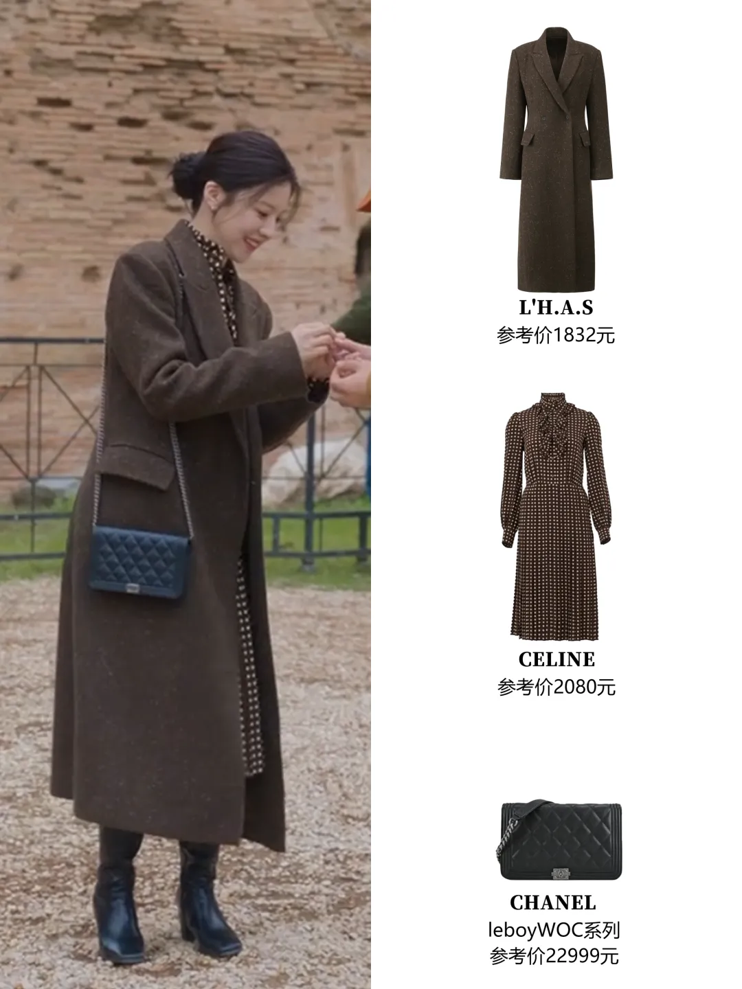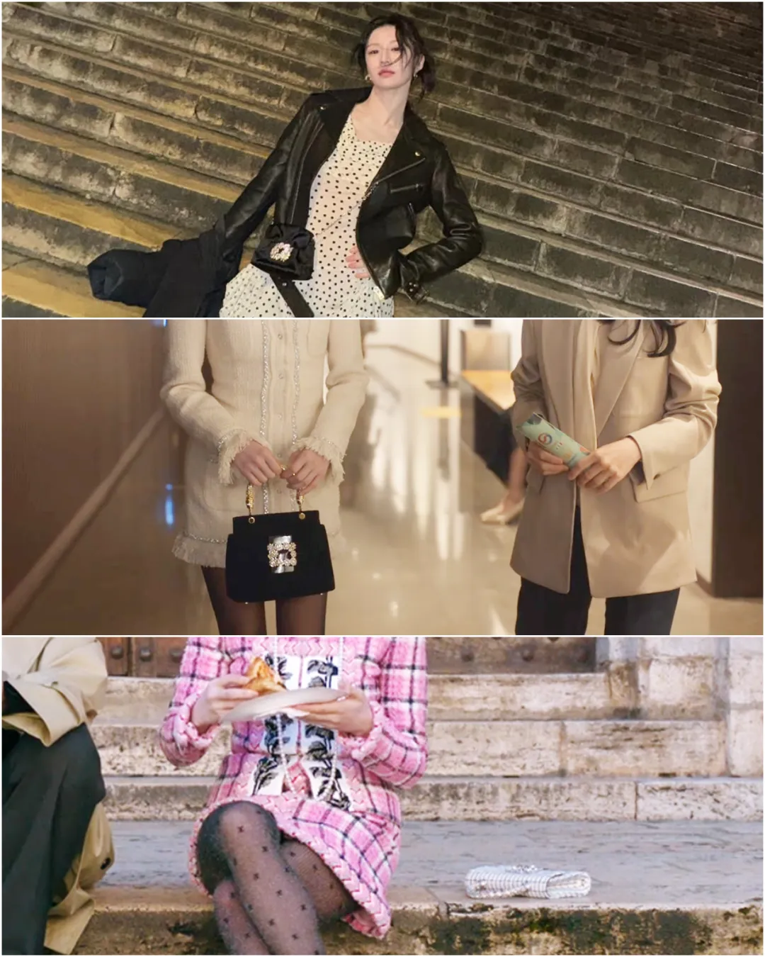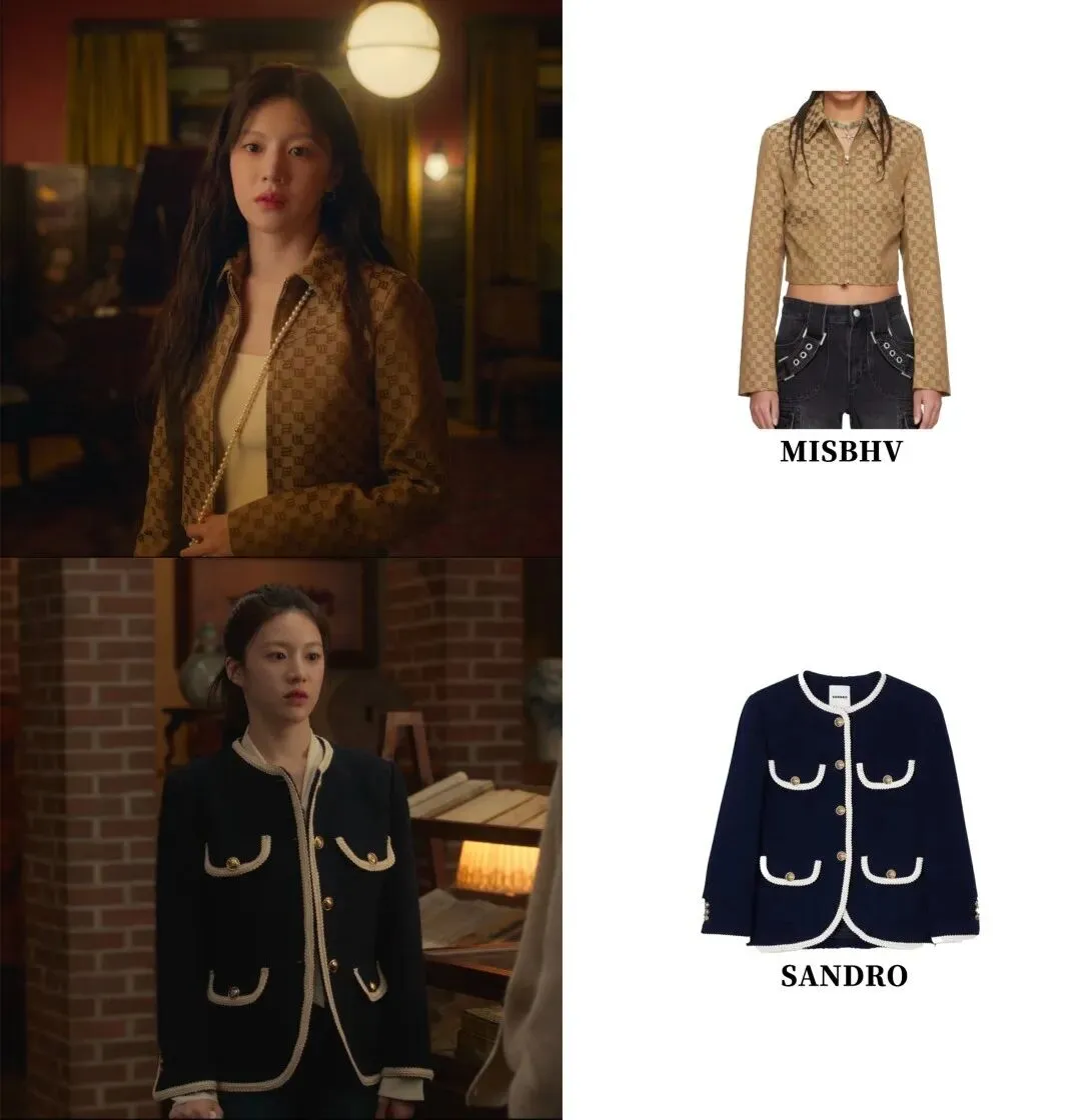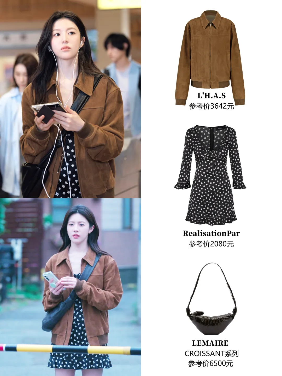 皮夹克+裙子,一点甜一点酷高允真说过自己身高是163cm,她骨架小、长相甜,整体量感是比较小的,在官方身高183.7cm的男主身边更是显得小小只。剧中很多穿搭都有尽量增加露肤度,大部分都是这个公式:能露腿的连衣裙做内搭,外面披上夹克,这样不太压身高,风格上也能软硬中和。就像第一集在日本镰仓这身:麂皮夹克+波点短裙+短靴。▼外套来自韩国牌子L'H.A.S,他家外套价位基本在1k-5k左右▼内搭的Realisation Par算得上是老网红了,他家裙子优势是剪裁很好,特别能突出曲线,尤其适合沙漏、梨形身材。高允真虽然很瘦,但胸腔饱满有肉,属于圆身,穿rp裙子也很好看。▼很多小伙伴被女主种草了这只深巧克力色Lemaire牛角包,目测是小号,小骨架友好。▼她在剧中的其他皮衣造型,也都遵循“一酷一甜”的反差法则。要么加一点蕾丝和珍珠元素,不过这三件皮衣目前已经买不到了。▼搭配休闲的牛仔衣,则会加上可爱的麻花辫。这件皮衣来自韩国原创设计师牌子Grove▼这套最妙的是内搭,一件Isabel Marant的挖空挂脖蕾丝吊带!还有剧中这身,男主的西装外套+针织套装,一下就把格子外套的严肃感化解了。▼内搭套装看着低调,其实大有来头~来自Chanel集团旗下的羊绒品牌Barrie。它是Chanel在2012年悄悄收编的苏格兰百年工坊Métiers d’Art。在被收购前,就已经为香奈儿做了20多年的羊绒衫,不少经典开衫很多都出自它手!走的是“幕后顶级工匠走向台前”的路线~Barrie特别擅长把衣橱里那些经典基础款,用顶级羊绒“翻译”一遍。比如军装夹克、飞行员夹克、牛津衬衫等等,看起来很有型,摸起来全是柔软温暖的羊绒。▼