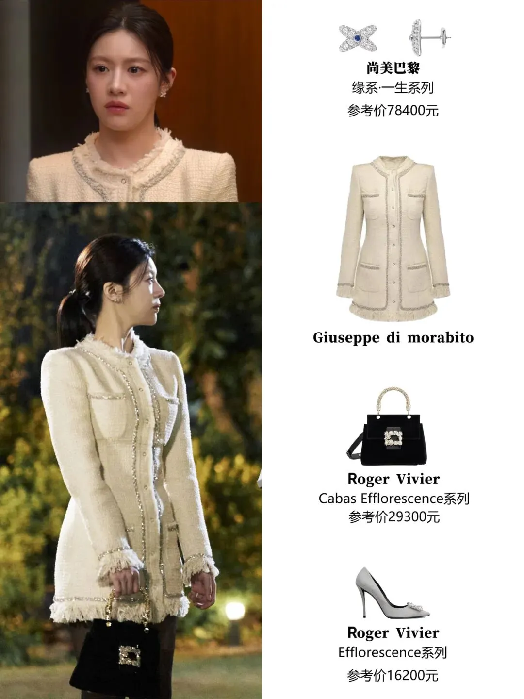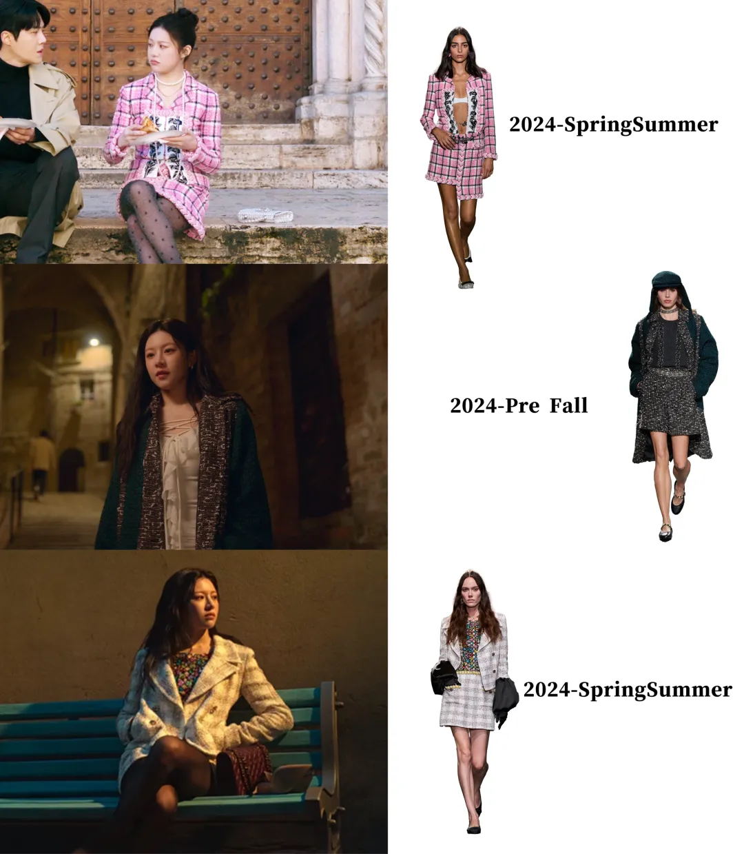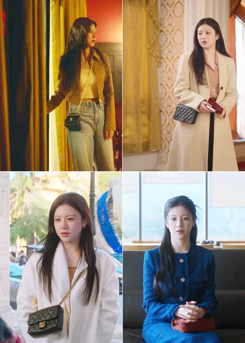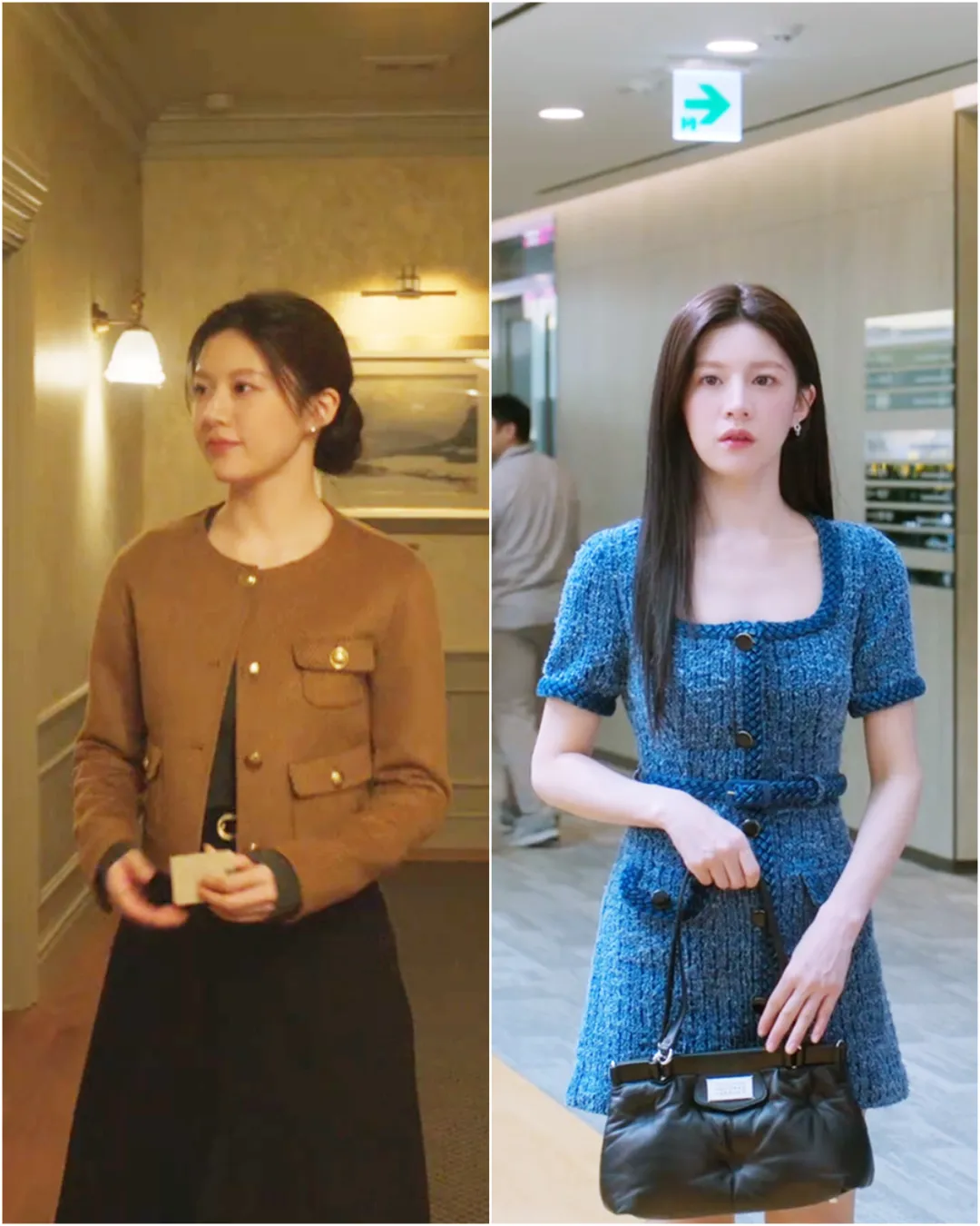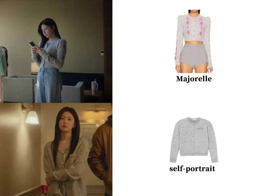 女主在剧中穿了好多粗花呢单品,一方面是韩剧造型师很喜欢给比较贵气的人设这样穿,另一方面高允真本人也和Chanel有合作关系。这部剧是2024年拍的,她穿了好多24年秀款,感受下资源和排面,把角色那种明星气场烘托得特别好。▼不过,里面的粗花呢单品,并不是全都来自Chanel。既有Balmain这种大牌(融合军装元素、力量感肩线,适合需要气场的镜头前时刻,女主昏迷半年醒来发现自己爆红时,穿的外套就是他家的)▼贵价意大利品牌Giuseppe di morabito,以女明星身份看音乐剧的时候穿了,搭配尚美的珠宝、Roger Vivier的鞋包,从头精致到脚。▼也有Sandro(左上+右上)、Majorelle(左下)、Cinq à Sept(右下)、Self-Portrait这种价位一两千的牌子,风格更年轻浪漫。▼前面说过,高允真虽然很瘦但属于小骨架圆身(右),很多粗花呢单品其实没有特别适合她。有些衣服上身会觉得显胖,尤其侧面会把衣服撑得圆圆的(左)。▼Chanel的衣服都是在车茂熙爆红后、录节目时出现的,私下基本没穿。▼有意思的是,第二人格都拉美在私下常常穿Chanel,是个爱花钱爱穿大牌的疯美人哈哈!▼为了区分两个人格,都拉美的搭配更性感外放,透肉黑丝+细高跟是必不可少的。▼荷叶边绑带裙,搭配质感厚重的Chanel斜纹软呢大衣,一轻一重,贵气又不失浪漫。▼韩剧里的秋冬,大衣造型从来都是重头戏,车茂熙在剧里也贡献了不少经典穿法。▼她选的大衣都主打简约利落,线条干净,面料看起来就很有筋骨,轻轻松松就把优雅干练的气场撑起来了。其中一个搭配公式:大衣+修身内搭+修身牛仔裤。其中有不少宽肩大衣,内搭就一定要利落,才能不那么压个子。她还会用一顶棒球帽来给造型注入活力,轻松示范了女明星私下那种舒服又时髦的下班状态。帽子来自Norse Projects▼剧中她也有穿颜色较深的大衣,在穿这类大衣时,她通常会用配饰去提亮脸部。灰色大衣则加入一抹亮蓝色的围巾,饱和度很高的蓝色很适合秋冬来提亮肤色。▼这套L'H.A.S灰色大衣的搭配本身是好看的,但是对高允真来说略沉闷。▼车茂熙私下休息的造型,基本被各种针织衫承包了。▼