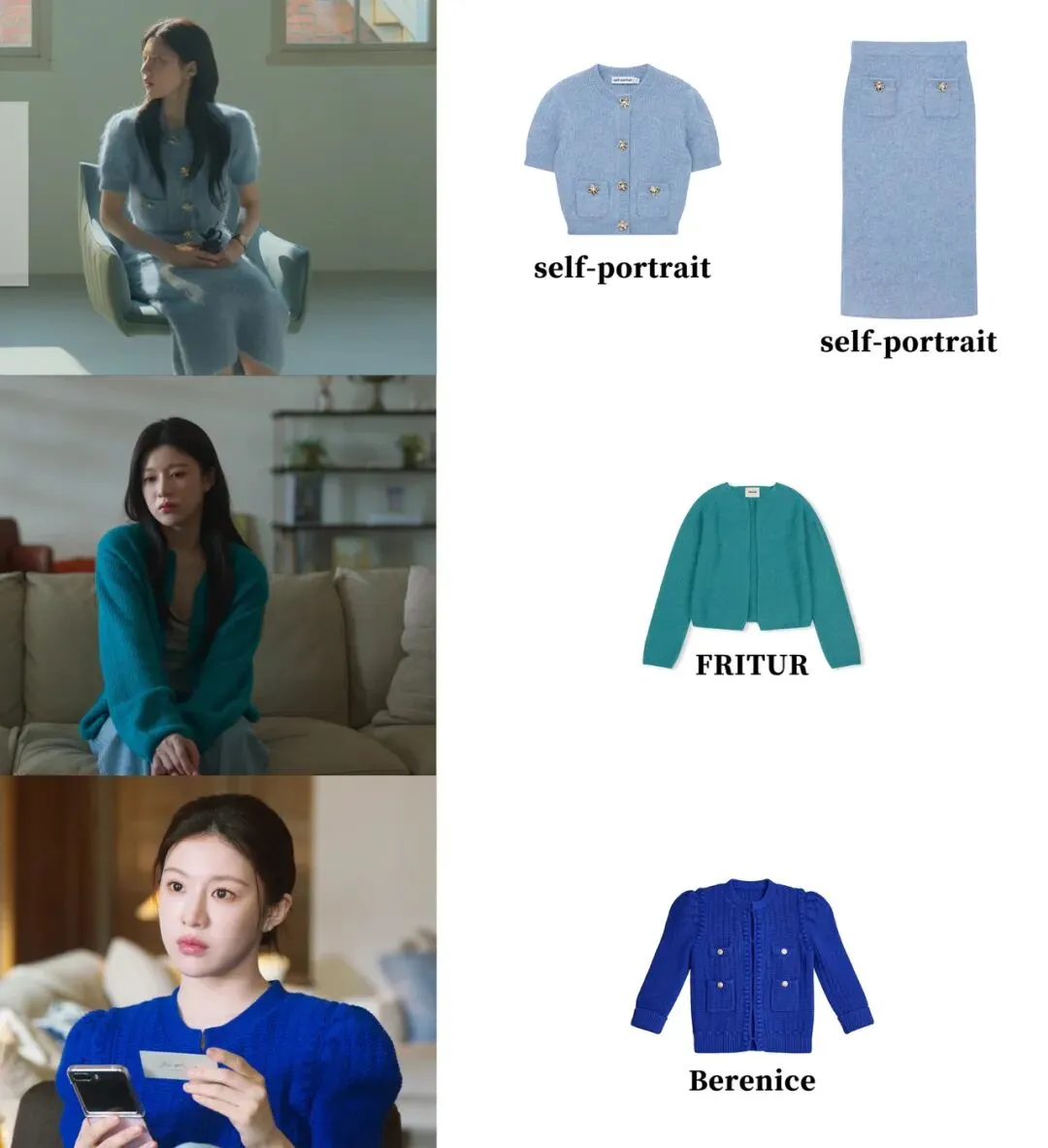 担心冬天没有露肤度会容易显沉闷,最简单的就是选择亮色的毛衣。比如这件浅蓝色的,蓝色系是非常适合亚洲人的肤色,暖黄皮穿上任何色阶的蓝色都会显得肤色很靓~针织套装来自Self-portairt,整体看起来干净又清爽。▼这件开衫来自韩国独立设计师牌子Fritur,浓郁又带点绿调的孔雀蓝,好衬肤色。▼克莱因蓝就不用多说了,亚洲人的肤色偏黄偏暖,克莱因蓝是很冷的蓝,冷暖对比之下,皮肤会显得更明亮。这款克莱因蓝开衫来自法国小众牌子Berenice。▼柔和的浅灰色同样对亚洲人肤色友好,浅色也很适合小量感身材。▼我们之前写达妹的时候就介绍过,他家非常擅长各种刺绣,收集世界各地的古老布料,拆解、重组,融入新衣服里。所以有些单品看起来会很像vintage,适合走复古风的朋友。达妹这件吊带就是他家的▼高允真作为香家大使,在剧中用到最多的Chanel单品,当然是包包啦。除了前面出现过的马吉拉、Lemaire,还有罗意威和Chloe,都是现在热度很高的品牌。▼价格相对比较亲民的是这只黑色托特,来自韩国牌子Stand Oil,他家价位集中在人民币几百块到一千多块。▼车茂熙在剧中的珠宝,走的是「低调的奢华」路线——堪称“小耳饰,大来头”的典范。