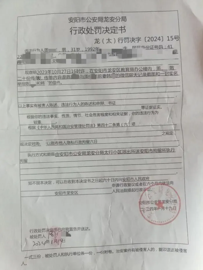 龙安区公安分局和该局彰武派出所出具的《受案回执》和《行政处罚决定书》显示,陈先生于2023年11月报警称被侮辱诽谤案,该所已经立案。周某因在龙安区教育局办公楼内散发20份传单,内有其前妻韩某与陈先生的聊天记录截图和一封实名举报信。周某被认定散布他人隐私被行政拘留6日。牵涉其中的贺某和李某也因公然侮辱他人分别被处行政拘留7日和罚款200元。