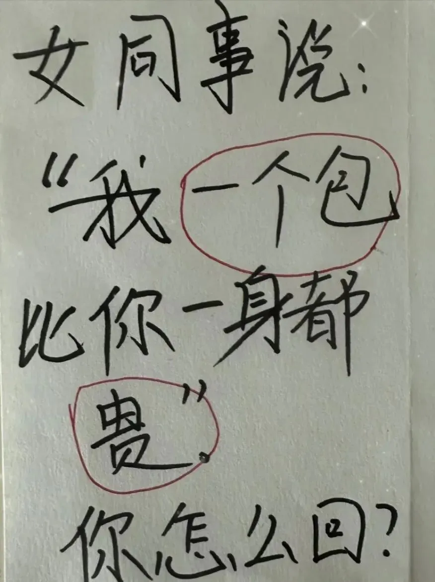 女同事说:"我一个包比你一身都贵“ 你怎么回?