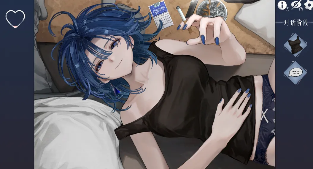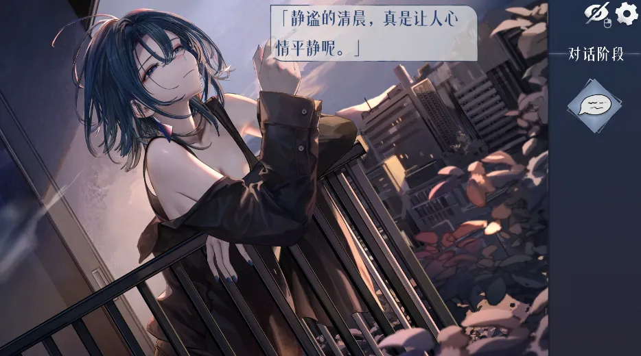 那头湛蓝的短发和习惯性夹在指缝间的香烟,配合 Live2D 细腻的动态,让这个角色在看到的瞬间就足以让大多数视觉小说爱好者心甘情愿地点击进来,步入这场由朝雾与烟草味交织的迷梦。