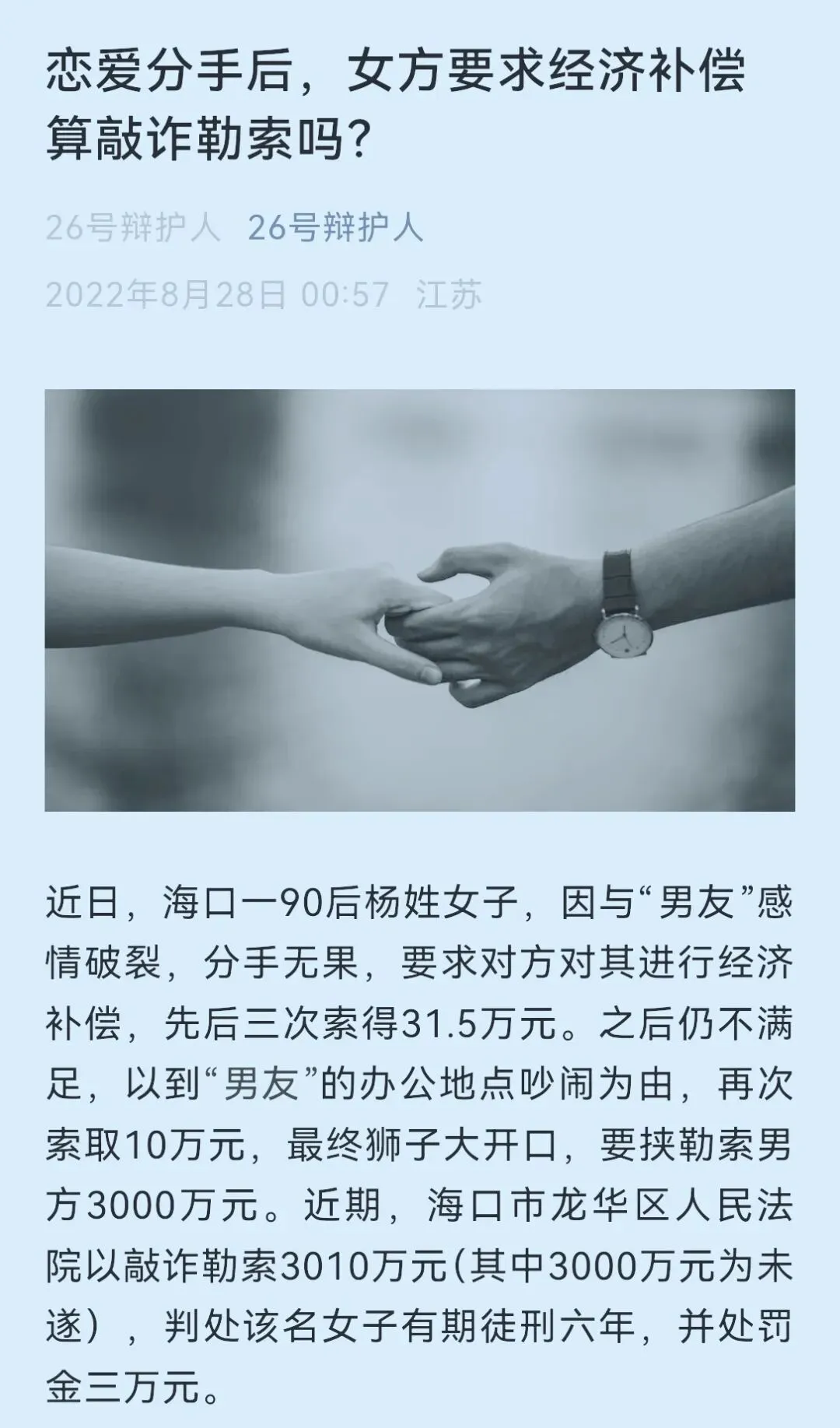 近日,夫妻网购娃娃菜后自导自演“中毒”事件、意图诈骗赔偿的新闻引发网友热议。这让笔者想起几年前的一起旧闻:海口女子在恋爱分手后多次索要经济补偿,最终因敲诈勒索罪被判刑六年。