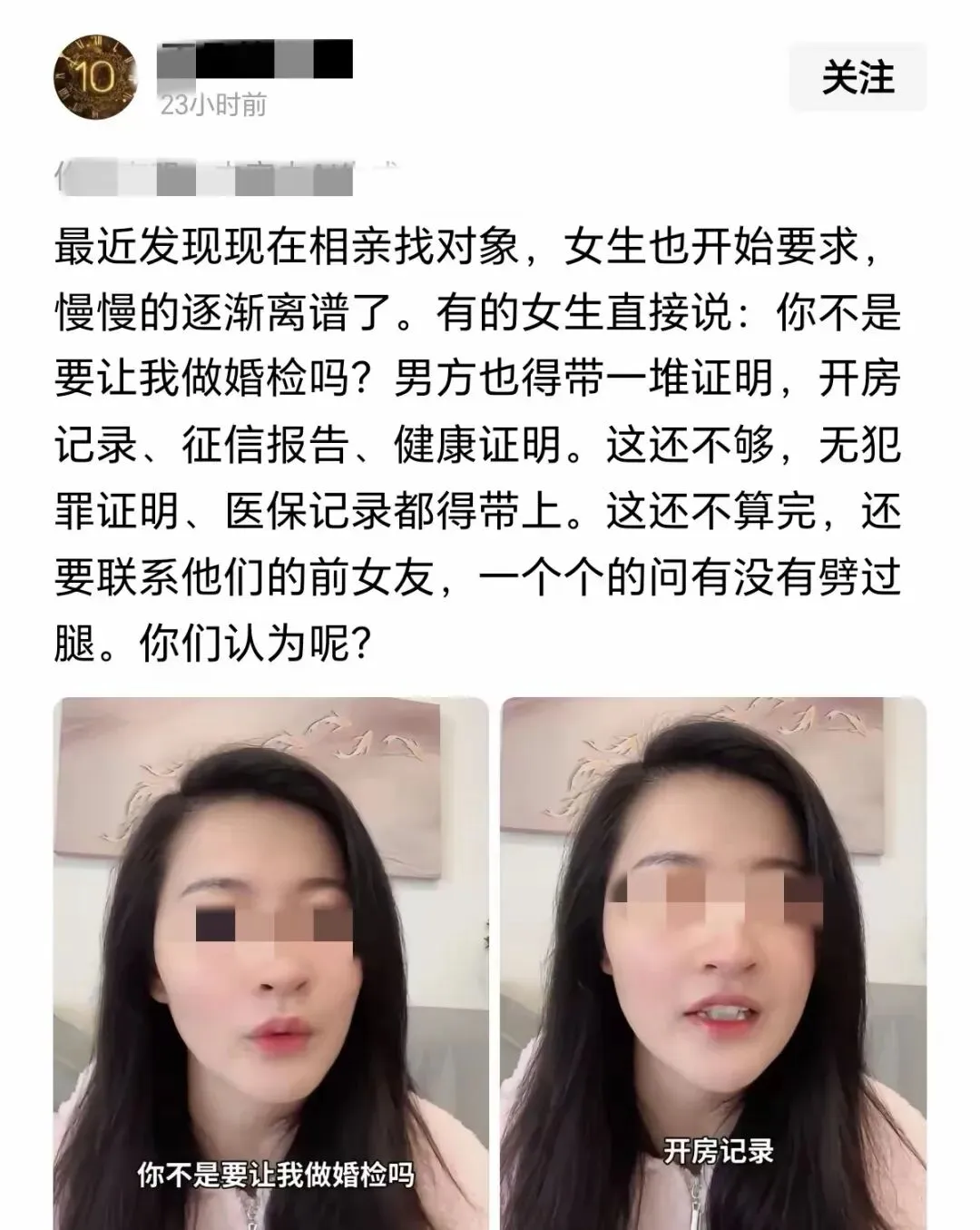 “你不是要婚检吗?那你也得出示开房记录、征信报告、健康证明、无犯罪证明、医保记录……还要联系你的前女友,问问你有没有劈过腿。”