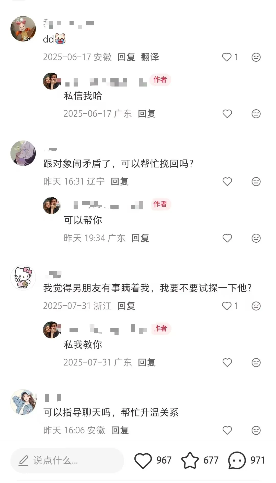 “普通人的机会,常在巨头的缝隙里。他们服务“大多数”,你就用心服务好“少数”被忽略的人。”大家好,我是安诺,你的互联网轻创业搭子,专注于互联网实操项目,让我们一起让搞钱变得更简单!今天给大家分享一个【情感恋爱军师】的玩法,现在很多人都面临情感难题:单身的找不到对象,恋爱的被渣男 / 渣女拿捏,相处中不知道如何沟通,纠结是分手、复合还是开启新恋情;甚至还有离婚人群,都需要第三方视角给出建议。这正是 “恋爱军师” 项目的核心机会 ——当局者迷,旁观者清。很多人深陷情感漩涡时,看不清问题本质,而我们作为 “军师”,凭借专业视角帮他们理清思路,解决情感困境,自然能收获大量精准用户。而且这个赛道的需求一直很旺盛。