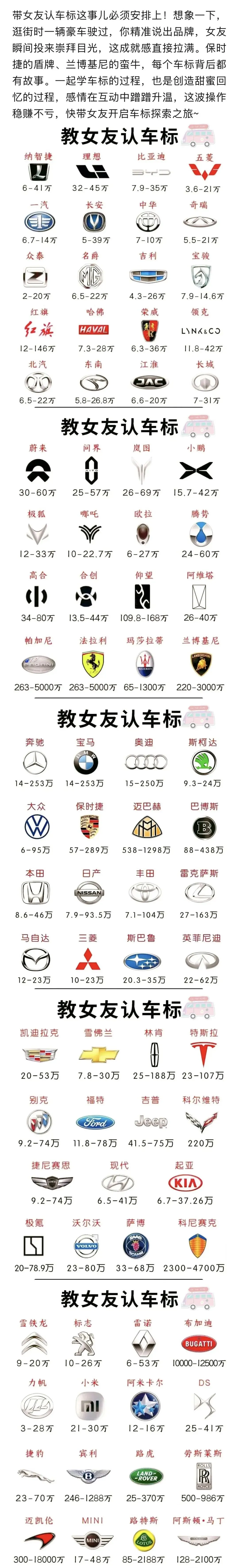 不用追求全记住,每次学三五个就够。慢慢你会发现,女友不仅能精准叫出路边车的品牌,还会主动跟你讨论“这个标设计好特别”,原本的小知识变成了情侣间的共同话题,让每一次出行都多了份小乐趣~