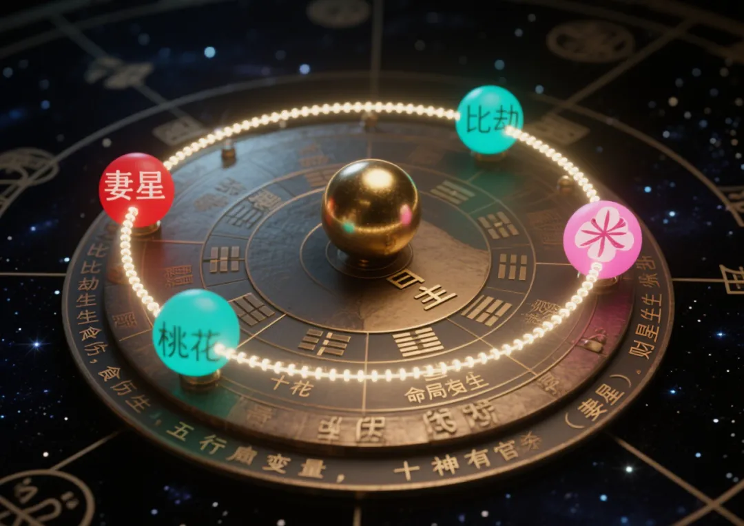 配偶星异常:男命以财星为妻,女命以官星为夫。若配偶星不现、落空,或为用神却弱而受制,婚恋易迟滞、配偶难寻;男命纯阴、女命纯阳,阴阳失衡,相处易走极端;命带两重桃花或墙外桃花,异性缘虽旺,却易陷入多角恋、用情不专,最终落得孤家寡人。