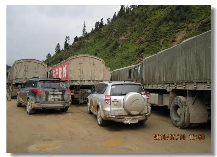 下午3点,因塌方,车队停下据说最长要堵4-5天,最快也要明天下午所有人只好原地待命,车里休息了...