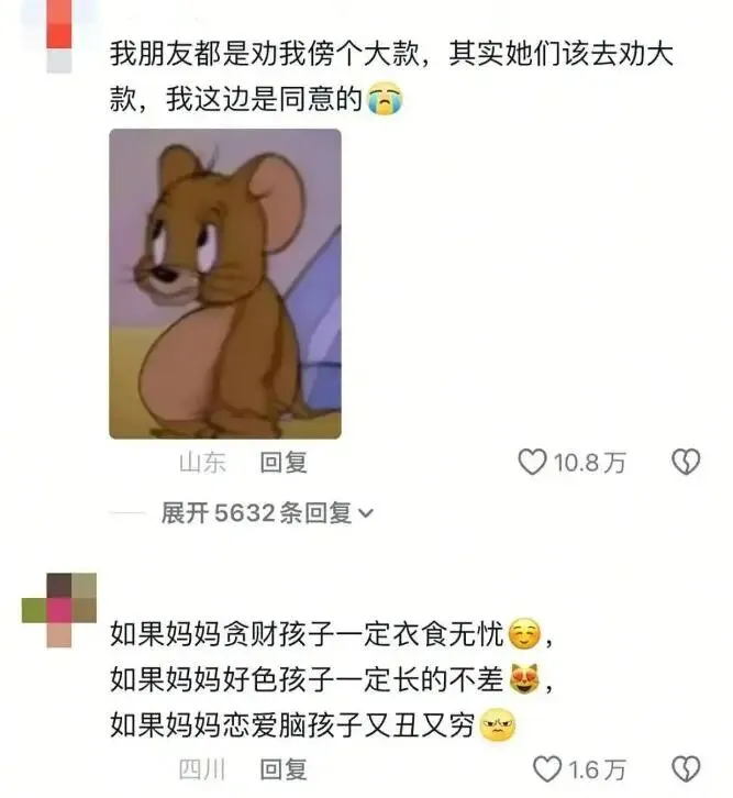 评论区更是涌现出了大批“现实主义家长”,有人直言:如果妈妈贪财,孩子一定衣食无忧;如果妈妈好色,孩子啊一定长得不丑;如果妈妈恋爱脑,孩子就会又穷又丑。