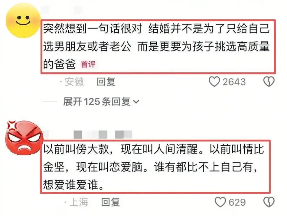 看了那么多宝妈的清醒发言,评论区的年轻网友也看清了现实:原来结婚并不是为了只给自己选男朋友或者老公,而是更要为孩子挑选高质量的爸爸。一席话让尚未踏足婚姻的年轻女孩们醍醐灌顶。