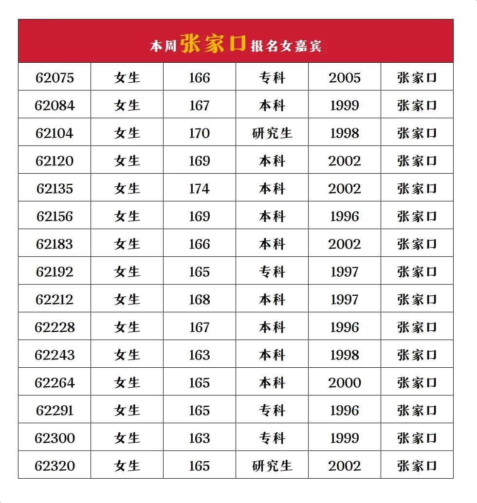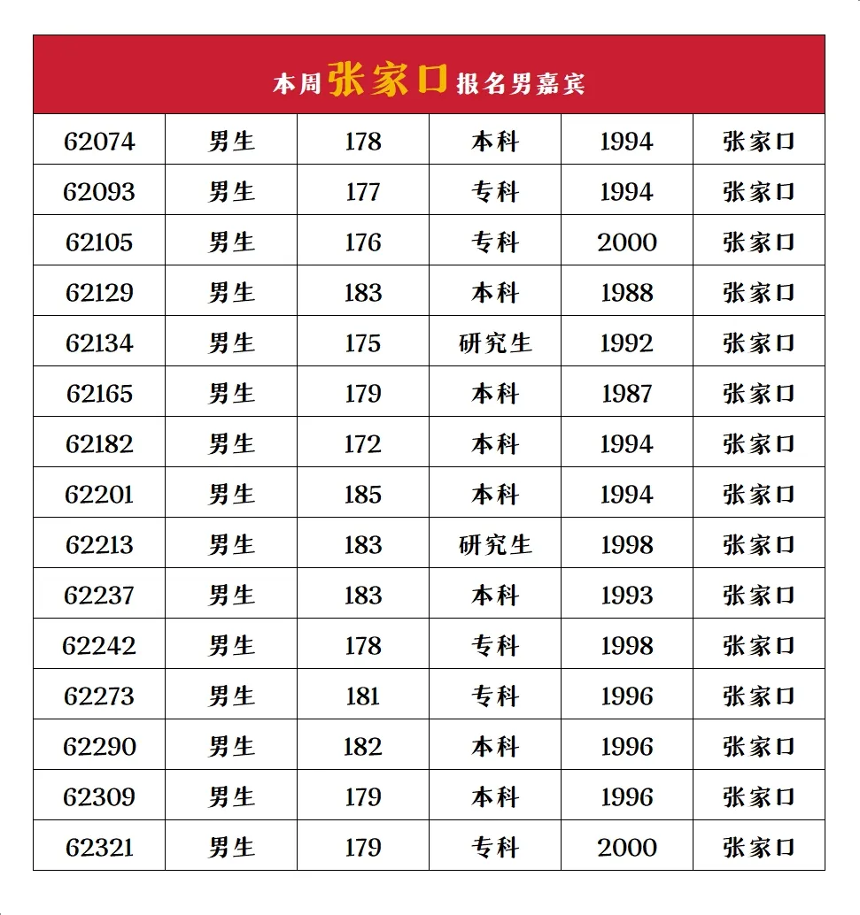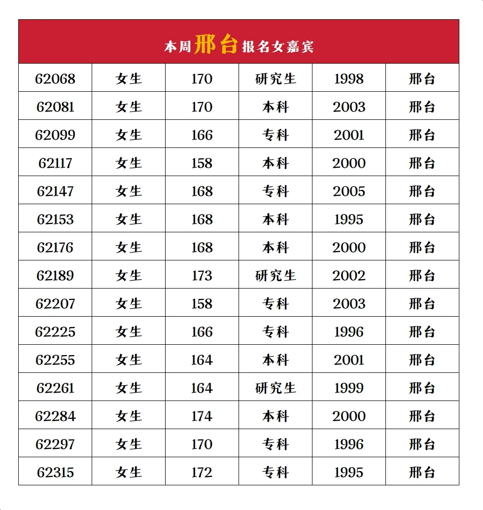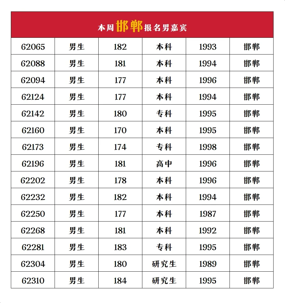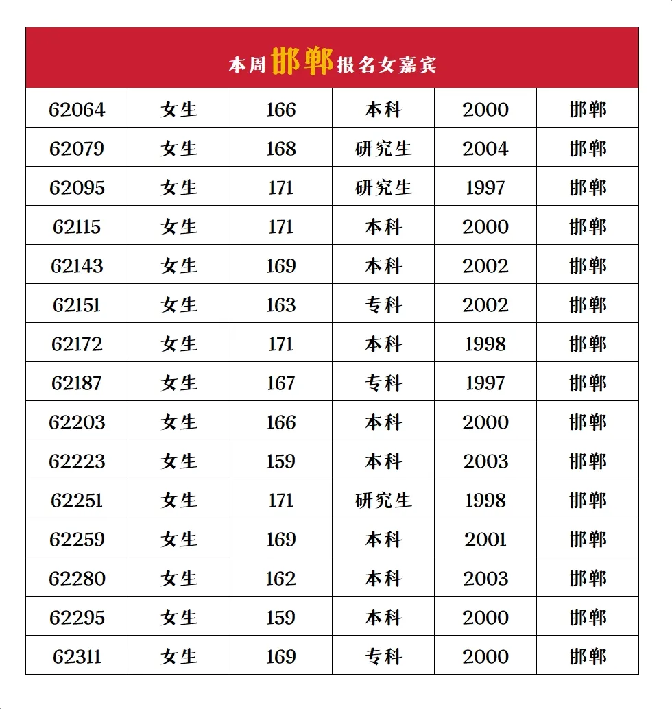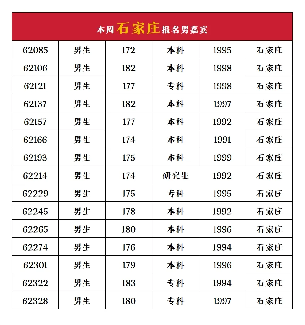 本期恋爱匹配已报名嘉宾,篇幅有限,每个城市仅展示部分嘉宾,目前河北开放城市:石家庄、保定、唐山、邯郸、沧州、邢台、廊坊、衡水、张家口。
