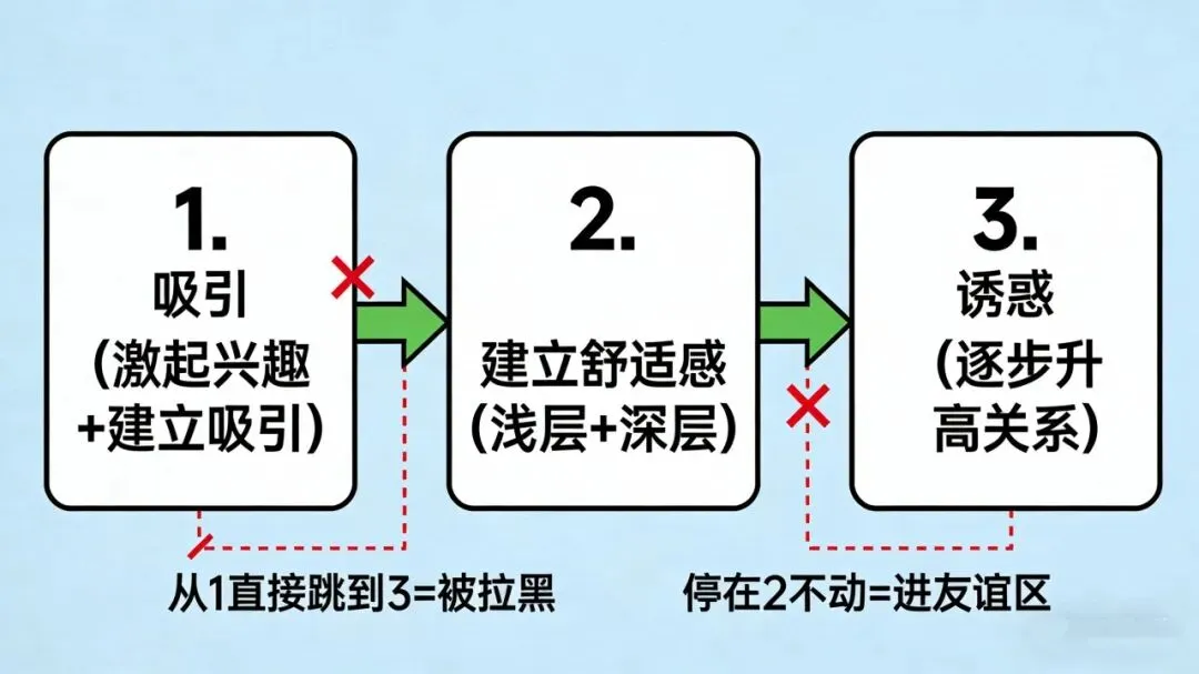 涛哥的“步骤思维” 明确指出:恋爱有且只有三步:吸引→建立舒适感→诱惑。跨步骤操作,结果就是被拉黑、发好人卡或沦为备胎。