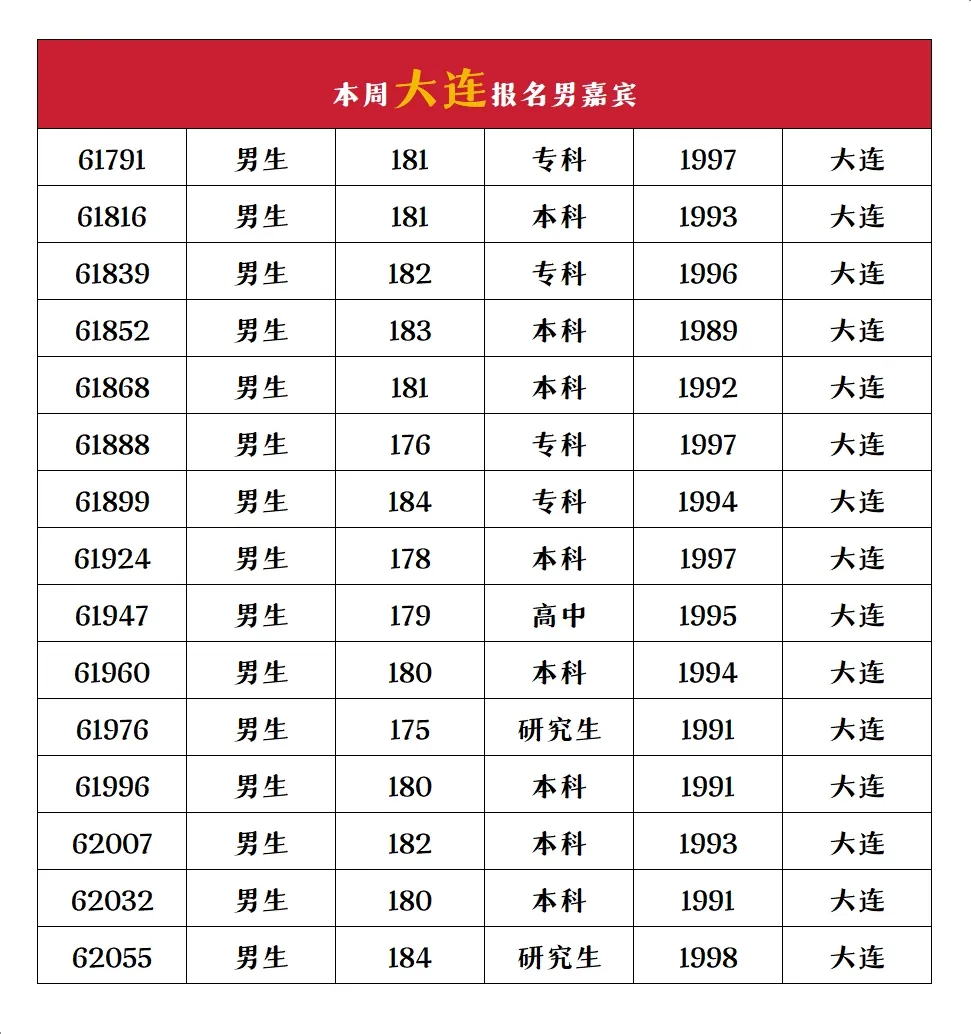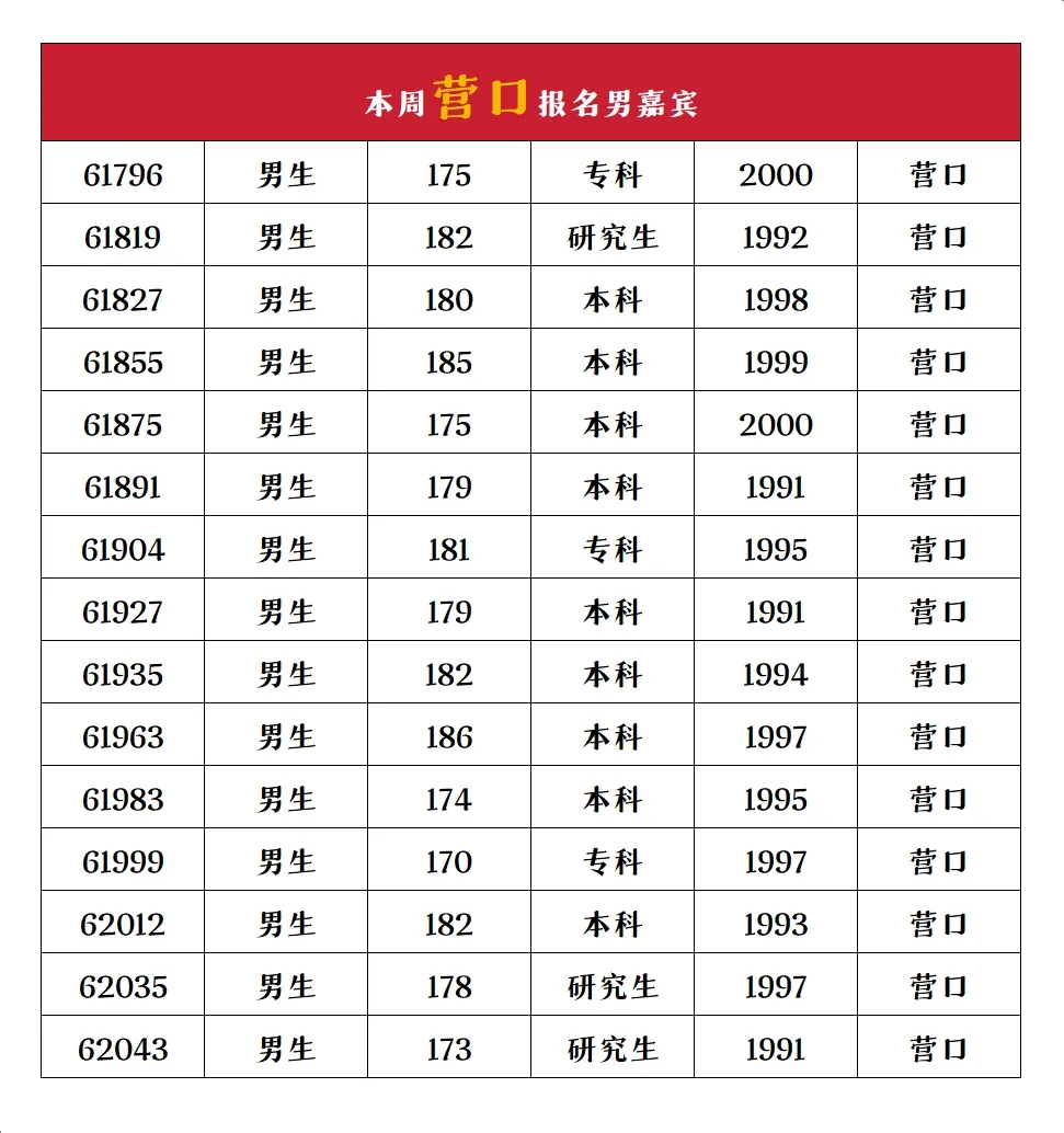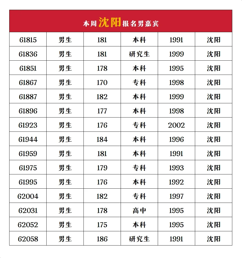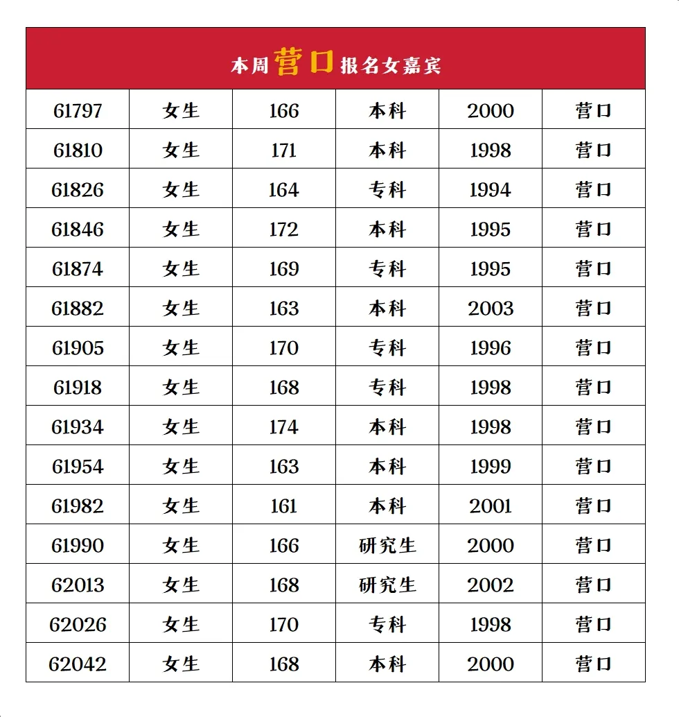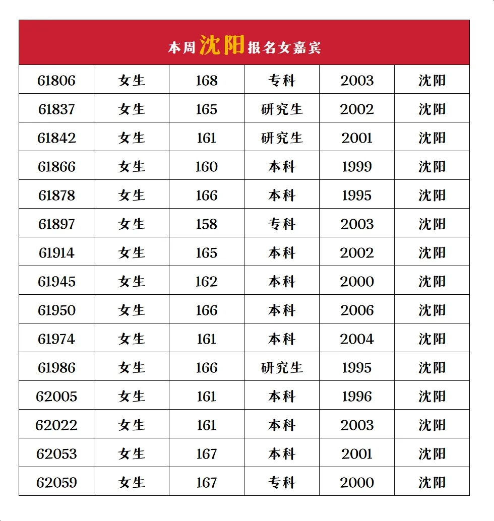本期恋爱匹配已报名嘉宾,篇幅有限,每个城市仅展示部分嘉宾,目前辽宁开放城市:沈阳、大连、鞍山、盘锦、锦州、营口、朝阳、本溪、抚顺