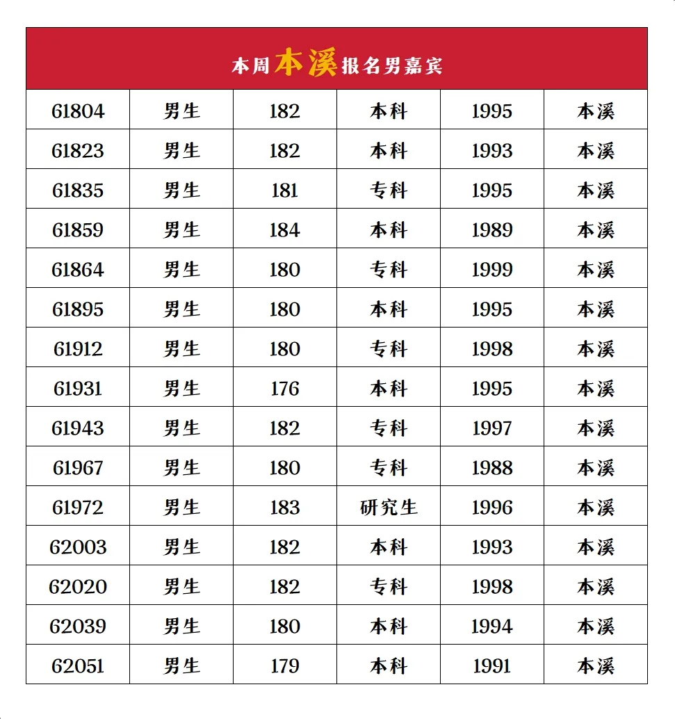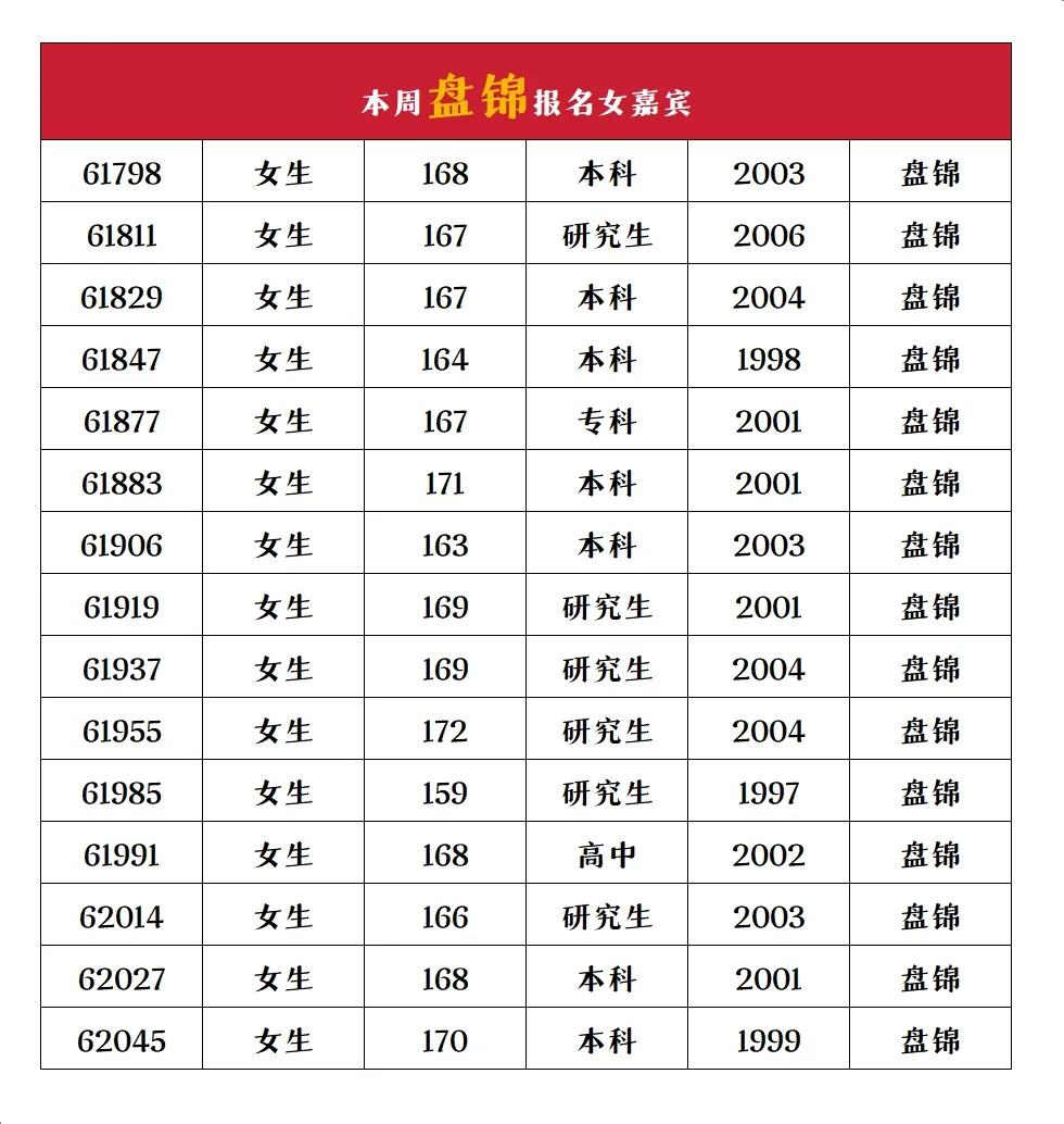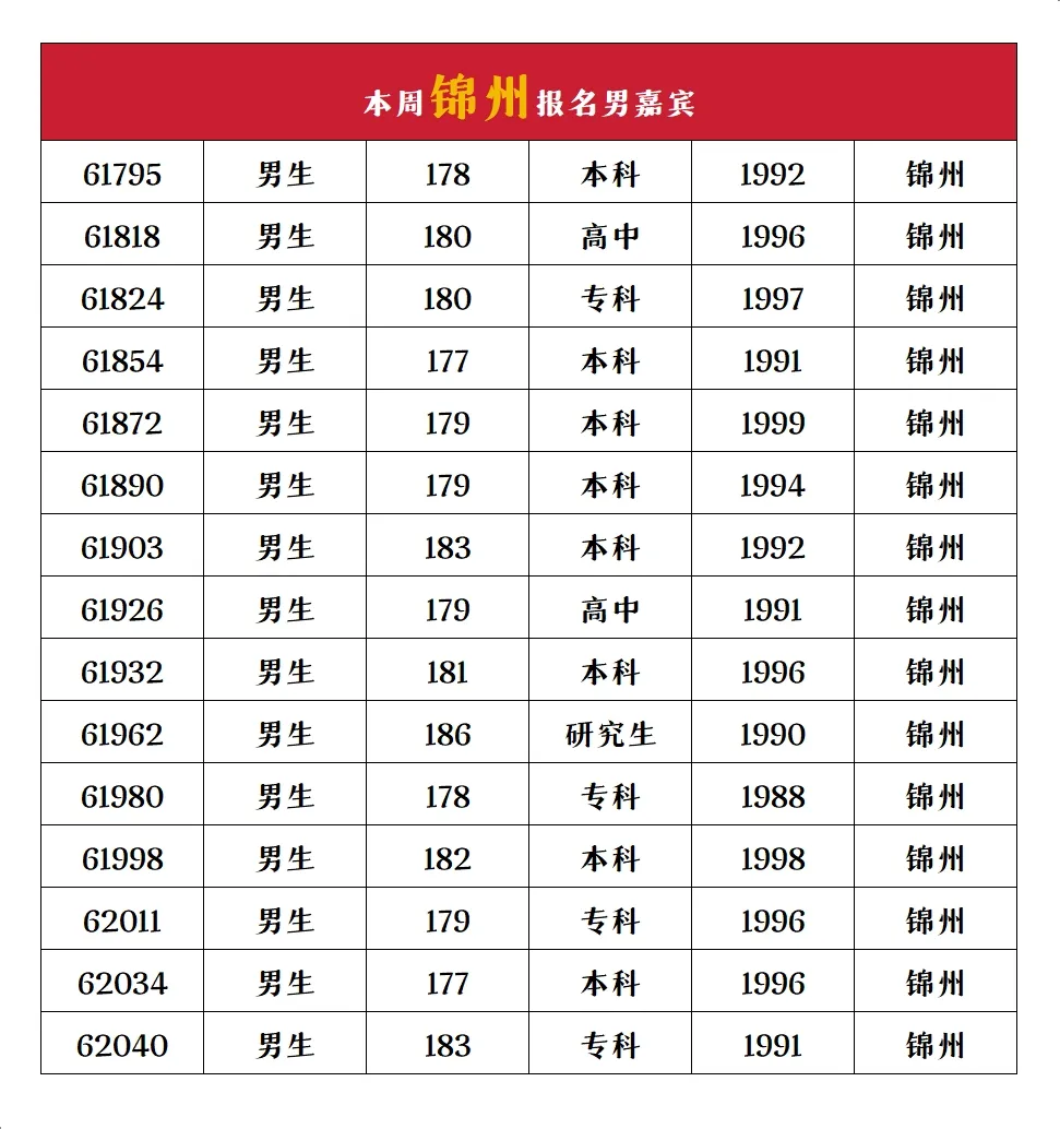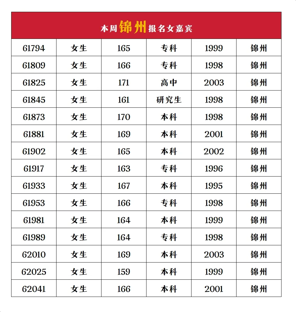 本期恋爱匹配已报名嘉宾,篇幅有限,每个城市仅展示部分嘉宾,目前辽宁开放城市:沈阳、大连、鞍山、盘锦、锦州、营口、朝阳、本溪、抚顺