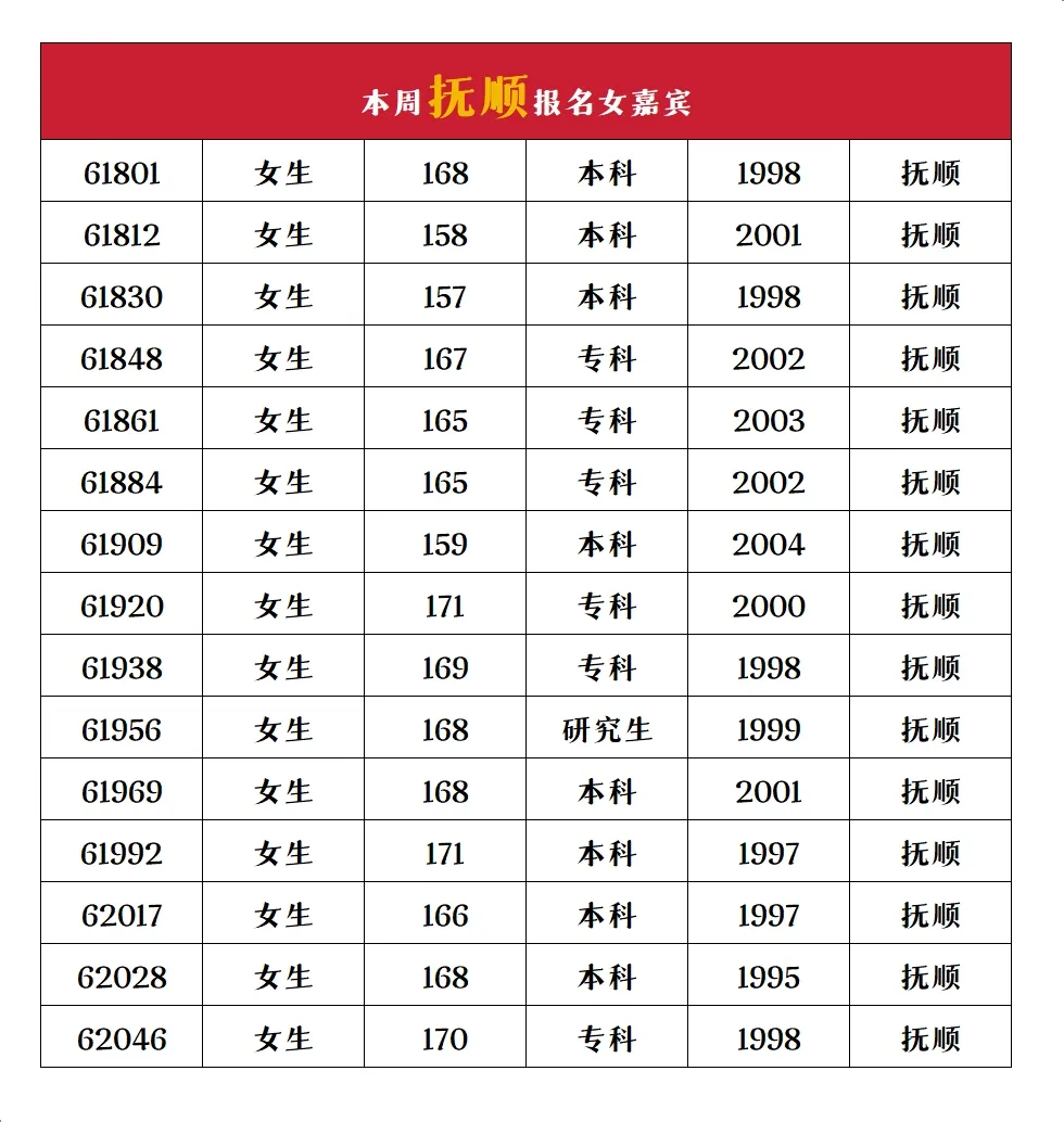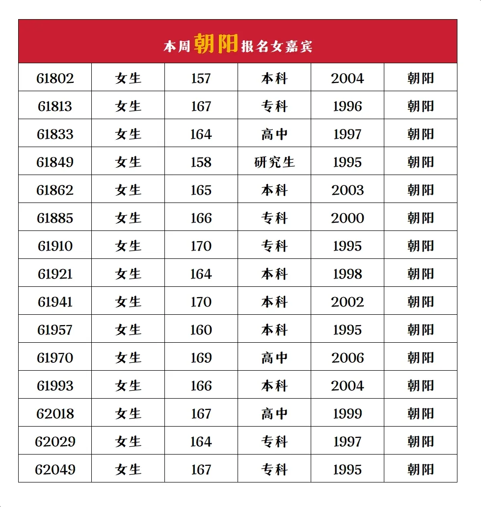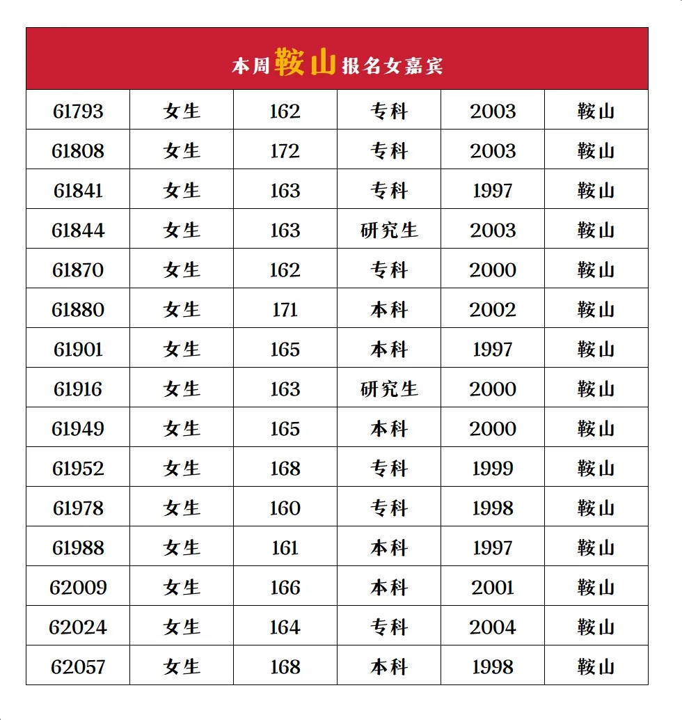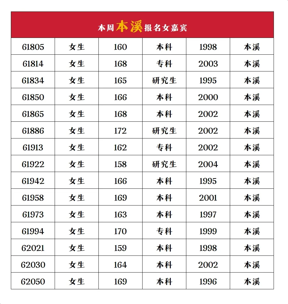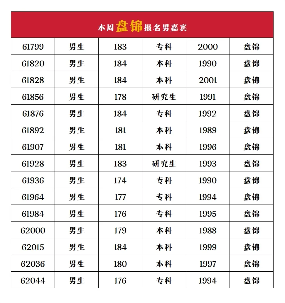 本期恋爱匹配已报名嘉宾,篇幅有限,每个城市仅展示部分嘉宾,目前辽宁开放城市:沈阳、大连、鞍山、盘锦、锦州、营口、朝阳、本溪、抚顺
