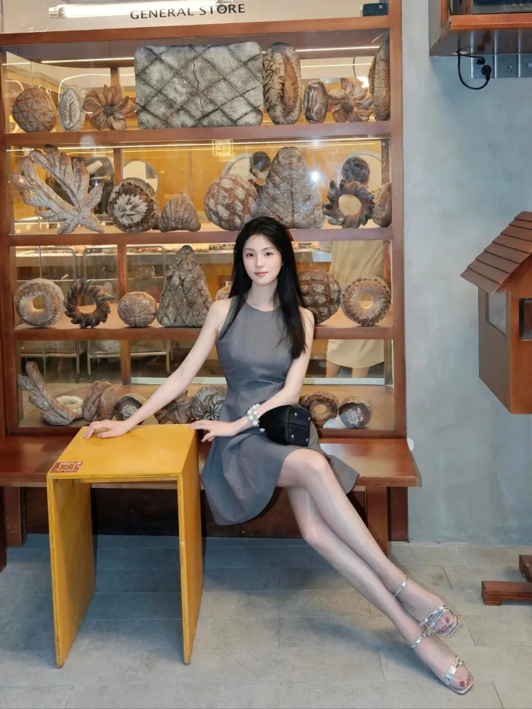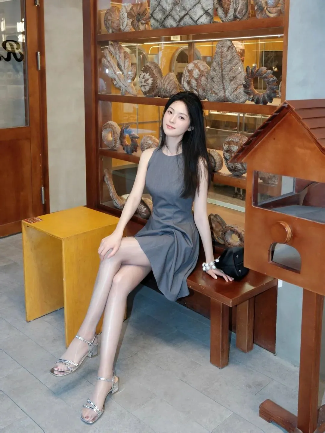 在温馨静谧的一方天地里,时光仿佛放慢了脚步,编织出一幅如梦如幻的画卷。柔和的光线如轻纱般洒落,为整个空间披上了一层温暖而柔和的色调,营造出一种惬意且浪漫的氛围。一位年轻女性宛如从梦幻中走来的精灵,成为这幅画卷中最耀眼的焦点。她身着一件灰色无袖连衣裙,那灰色恰似暮霭中的轻云,低调而不失高雅,带着一种神秘而迷人的气质。无袖的设计巧妙地展现出她纤细而柔美的双臂,线条流畅自然,仿佛是艺术家笔下精心勾勒的杰作。裙子的剪裁贴合身形,恰到好处地凸显出她曼妙的身姿,既不会过于紧身而显得拘谨,也不会过于宽松而失去韵味。裙摆随着她的动作轻轻摆动,似是微风中摇曳的花朵,散发着一种灵动的美感。搭配这身灰色连衣裙,她选择了一双银色高跟鞋。银色如同夜空中的繁星,闪耀着璀璨而迷人的光芒,为整体造型增添了一份华丽与时尚。