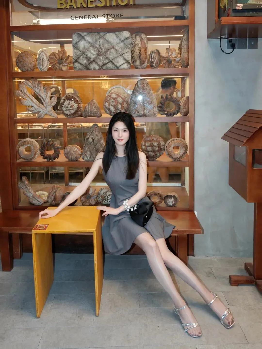 鞋跟的高度恰到好处,让她在行走间显得更加挺拔自信,每一步都仿佛踏在云端,带着一种超凡脱俗的气质。她的步伐轻盈而优雅,仿佛是在演绎一场无声的舞蹈。她的手腕上戴着一块精致的手表,表盘闪烁着细腻的光泽,仿佛是时间的守护者,记录着她生活中的每一个美好瞬间。手上拿着的黑色小包,款式简约而不失时尚,与灰色连衣裙和银色高跟鞋形成了鲜明的对比,却又在不经意间达到了和谐的统一。小包的大小适中,既方便携带物品,又不会显得过于累赘。她的头发如黑色的瀑布般自然垂落,柔顺而有光泽,偶尔几缕碎发调皮地散落在脸颊旁,为她增添了几分俏皮与可爱。她的面容精致而白皙,眉如远黛,眼若星辰,眼神中透露出一种灵动与聪慧。高挺的鼻梁下,是一张微微上扬的嘴唇,那抹淡淡的微笑如同春日里的暖阳,温暖而治愈,让人不由自主地沉浸在这份美好之中。
