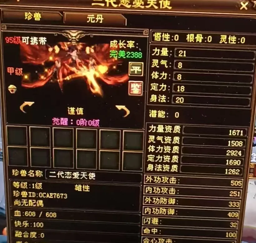 小编在经典《天龙八部》【武林至尊】服务器发现一只超顶的宝宝,直接看呆!这只【恋爱天使】裸资高达 2924,吃上双 10(分别乘 1.393、1.34)后,资质直接冲到 5458,成长率还是 2388 大完美,说它是史上最牛的恋爱天使宝宝,真的一点不夸张!