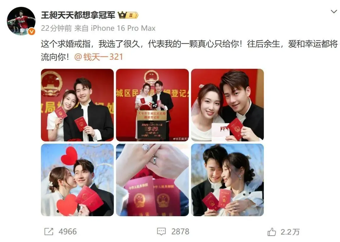 羽毛球名将王昶与乒乓球运动员钱天一已于2026年2月7日正式官宣领证结婚,王昶在社交媒体发布钻戒照片深情求婚,钱天一甜蜜回应“生日愿望成真”,引发全网祝福。