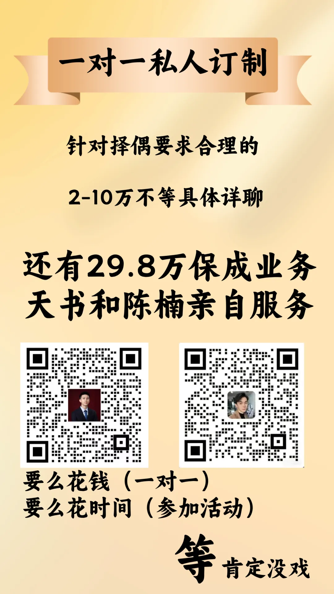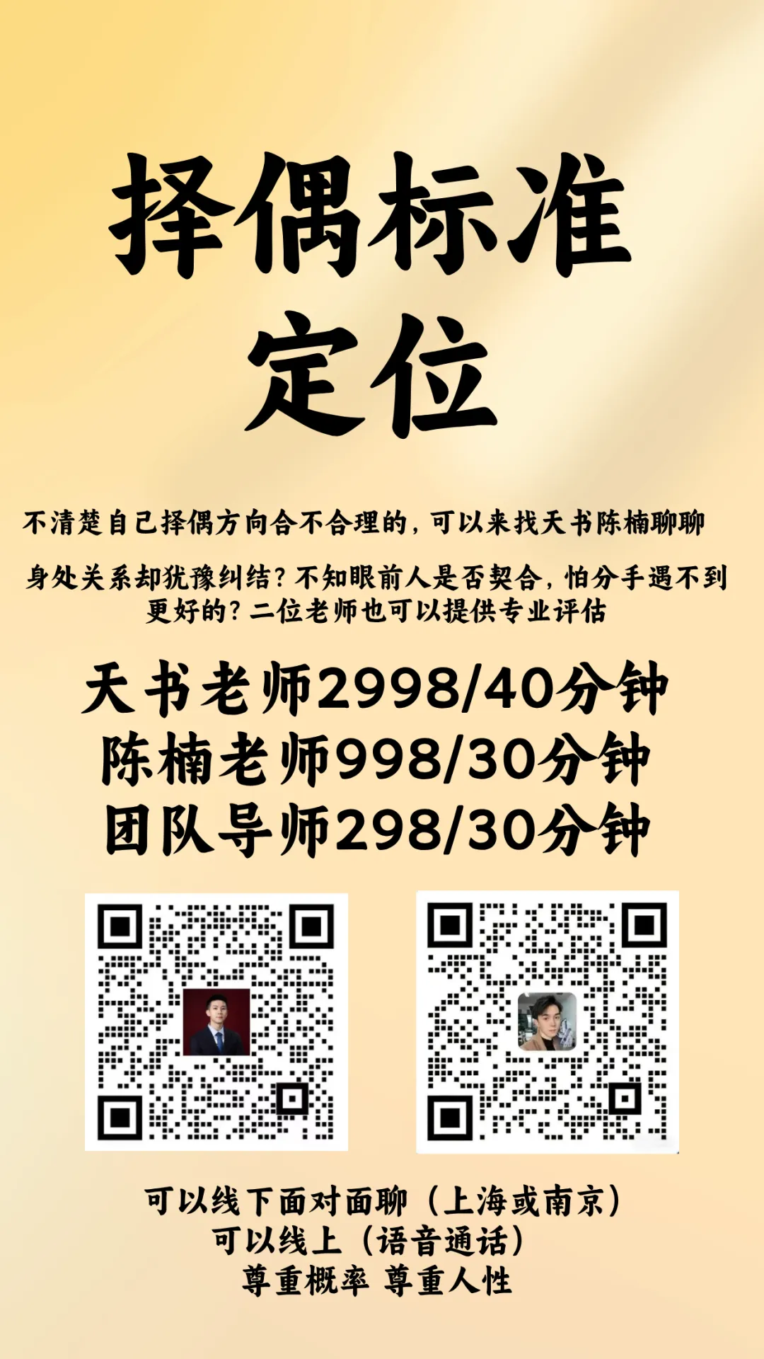 如果你正卡在择偶迷茫期,不知道如何精准定位、打破竞争困境,也可以找我们做择偶定位或一对一私人择偶规划,结合你的自身条件和市场情况,定制专属脱单思路,帮你避开误区、高效遇见同频的人。