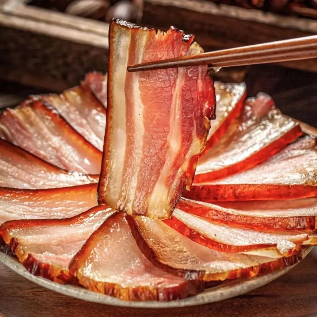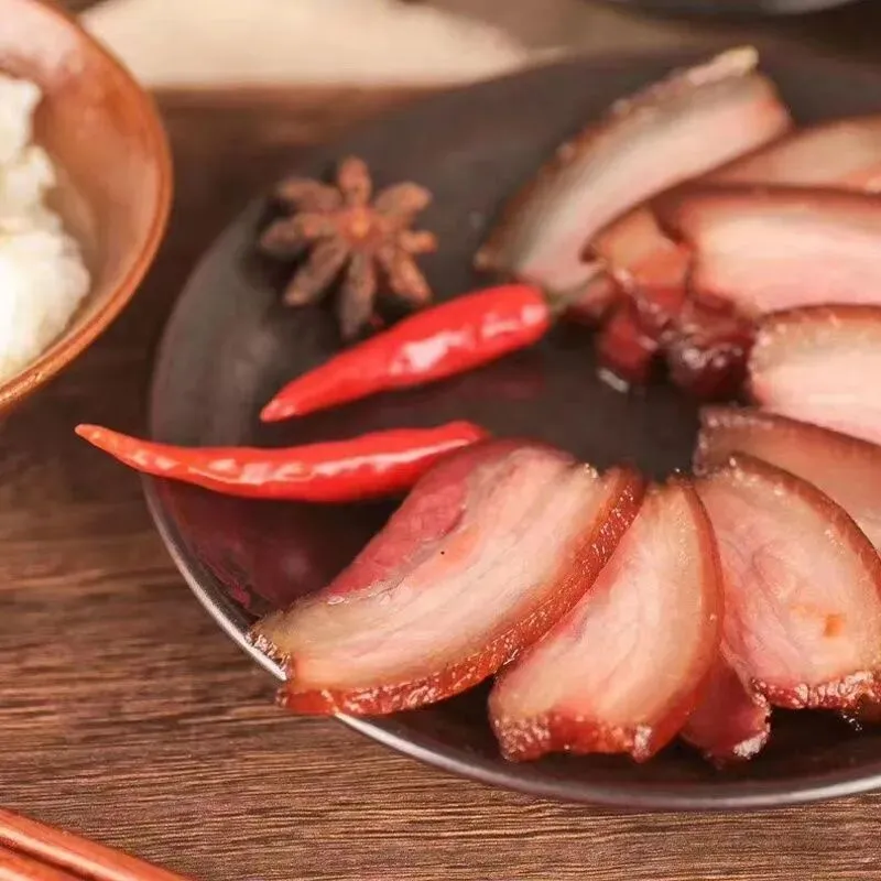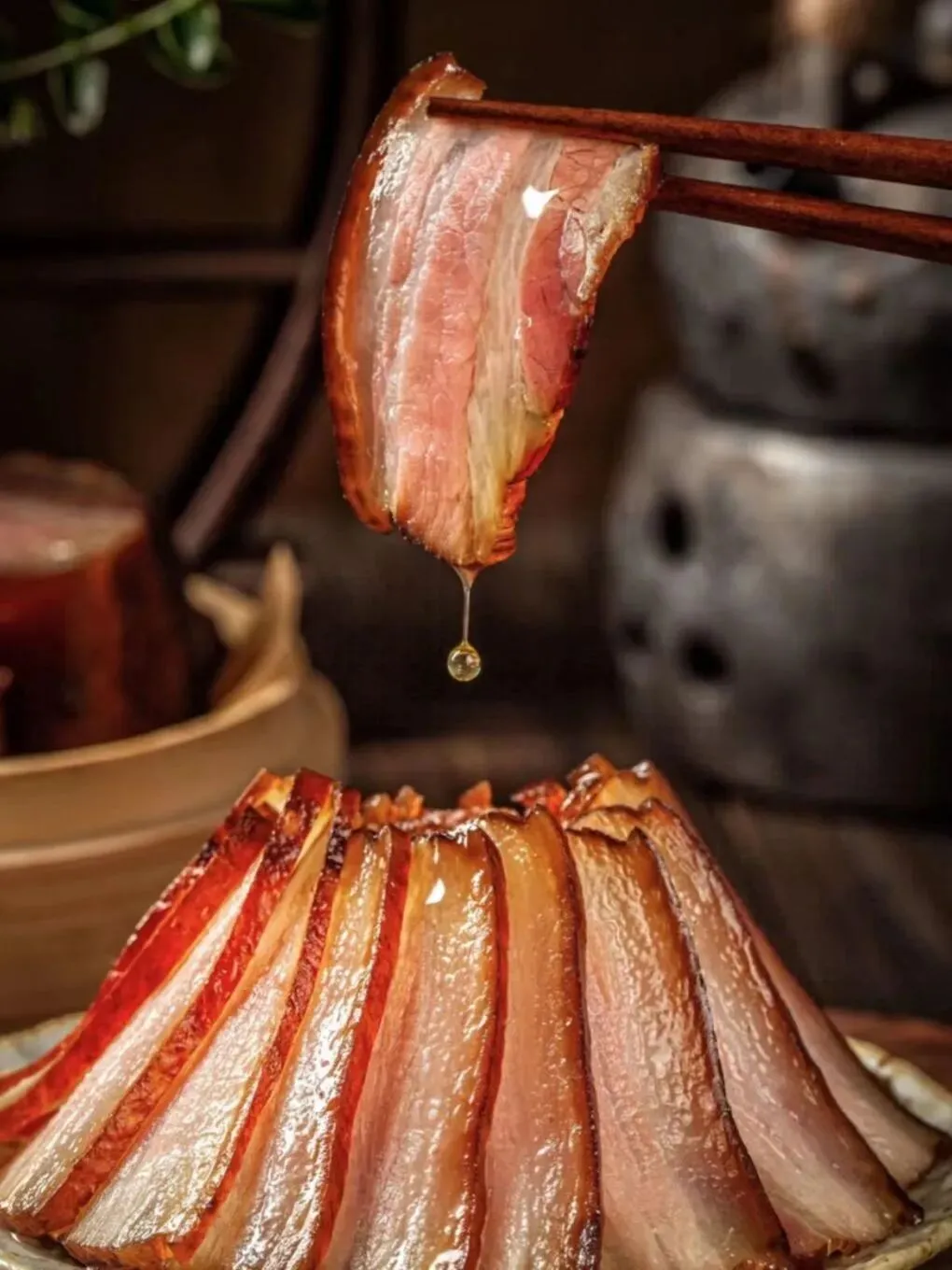 腊肉要一般是由猪肉经过盐浸渍数日,然后用柏树枝条树叶熏烤和凉干。