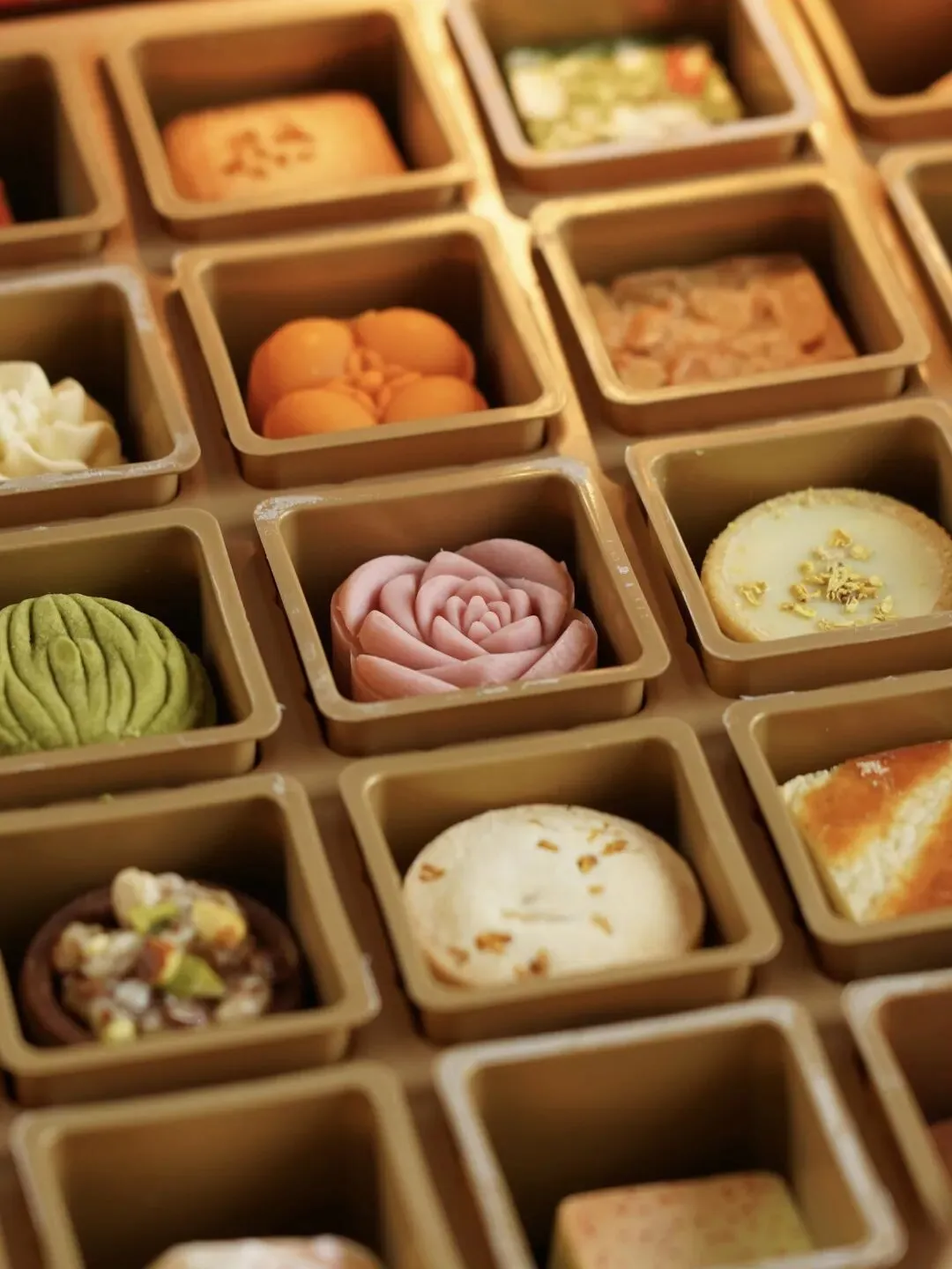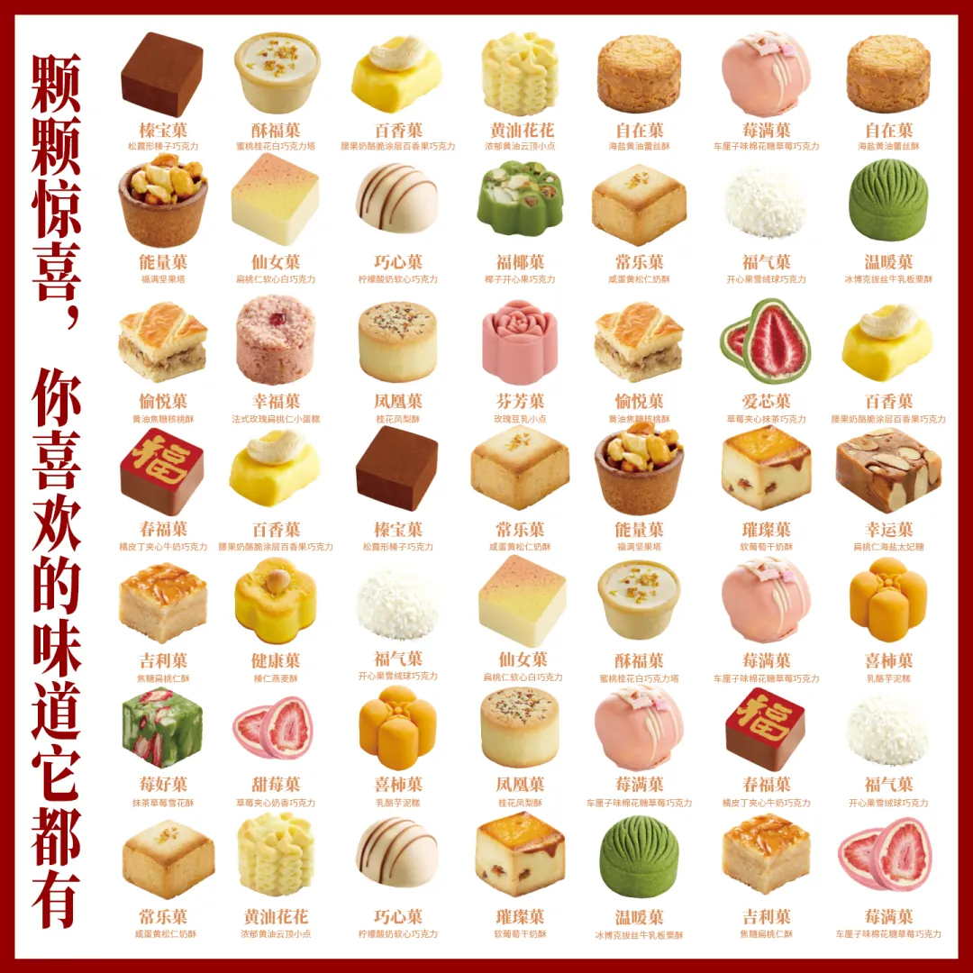 从手工夹心、松露巧克力、太妃糖,到中式点心、曲奇、雪花酥、坚果塔,中西融合,丰富多变。