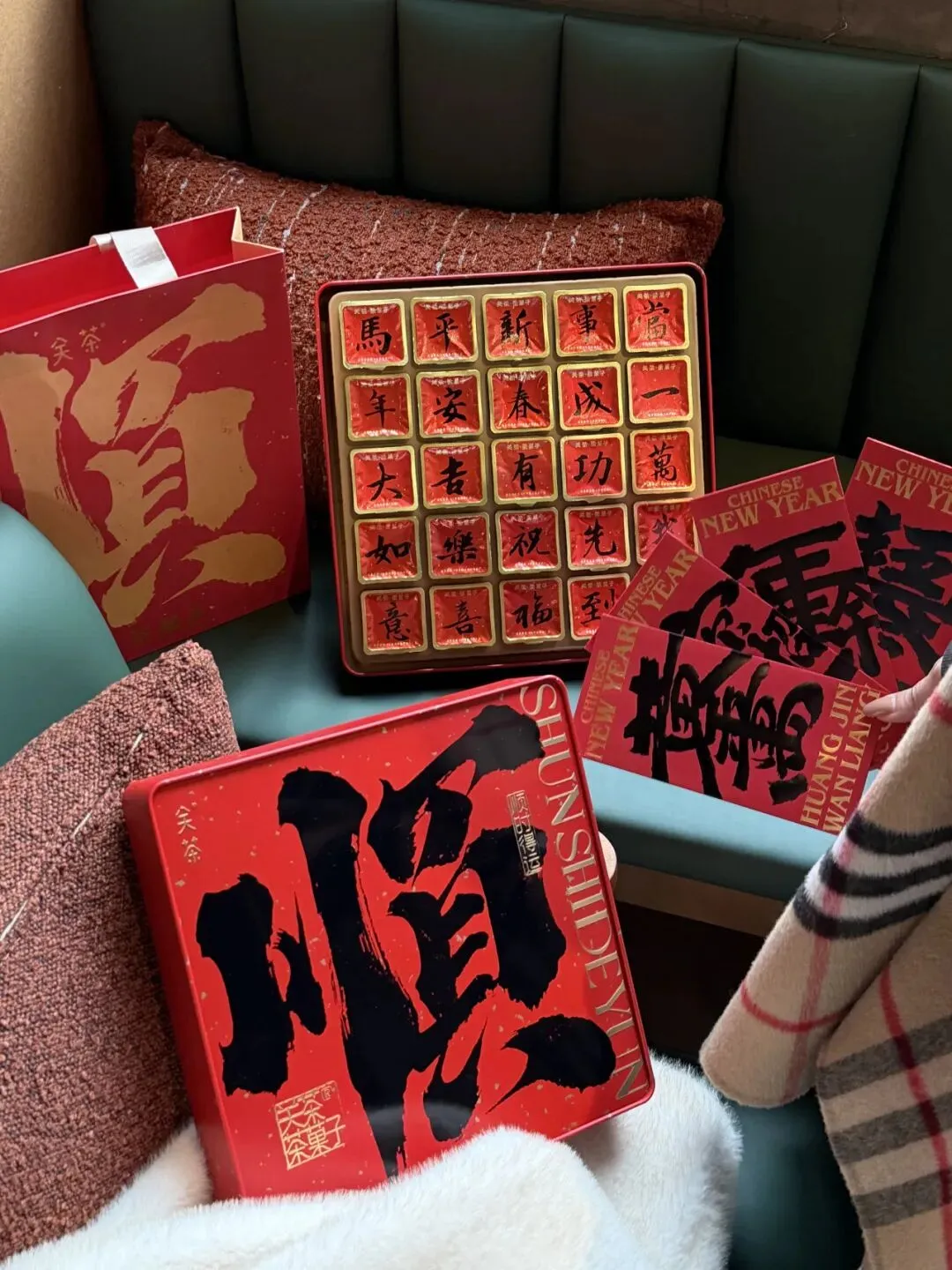 每颗小金盒以书法封膜呈现,可拼出「马年大吉」「马上有福」「马到成功」等马年祝词,祝福可见,心意有形,超级有新年氛围!