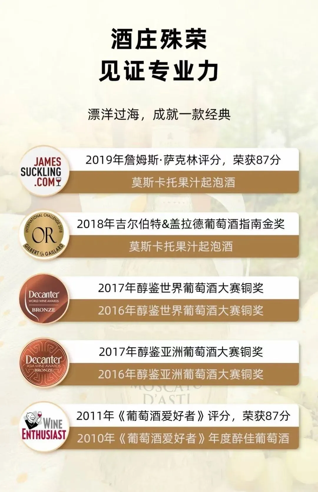 它采用95%Asti莫斯卡托(Moscato)葡萄+5%纯天然水果发酵。