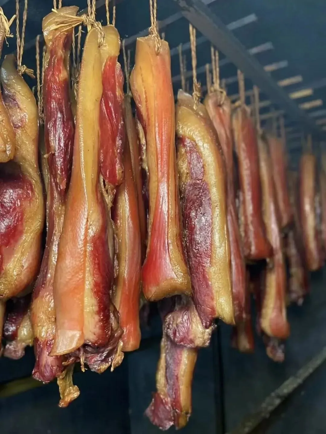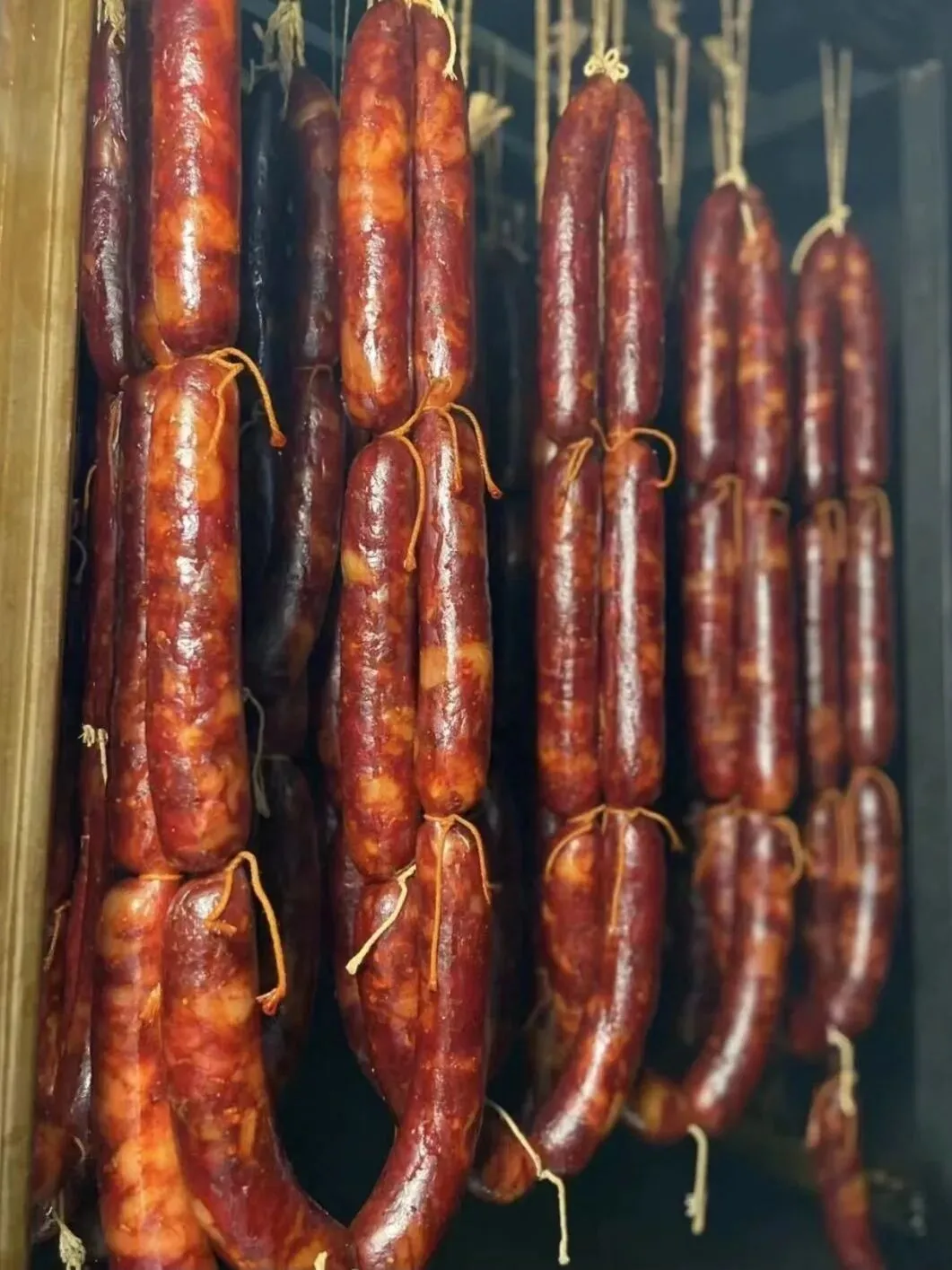 肉要距离明火三四米高度,用小烟慢慢熏,柏树特有的脂香渐渐渗入香肠,熏染出一层金黄,最后变成油亮的深棕。