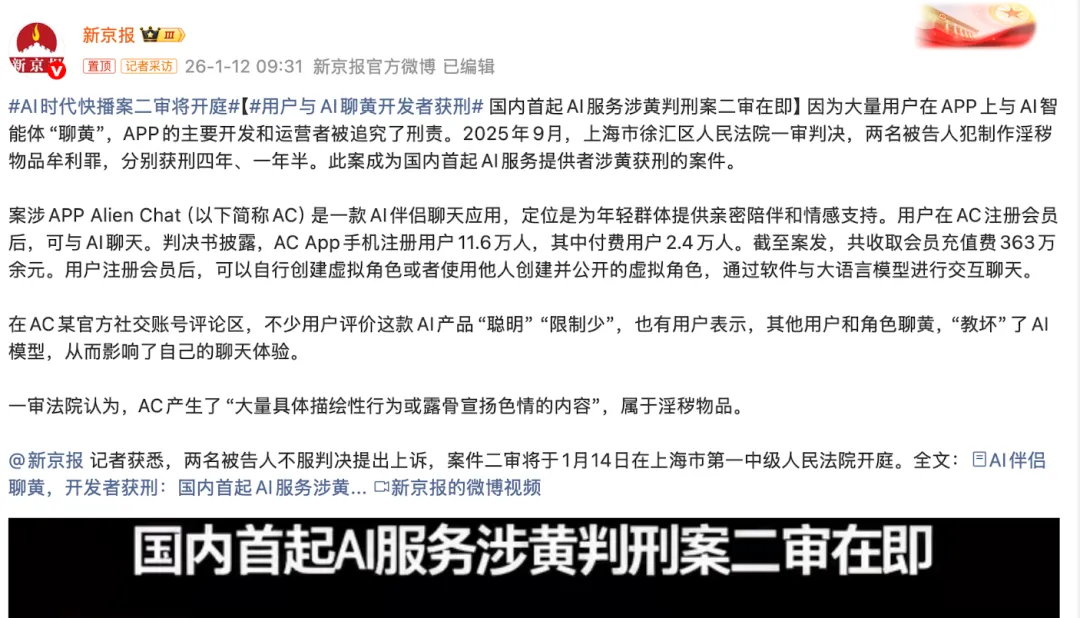 AI时代快播案二审将开庭,因为大量用户在APP上与AI智能体“聊黄”,APP的主要开发和运营者被追究了刑责。2025年9月,上海市徐汇区人民法院一审判决,两名被告人犯制作淫秽物品牟利罪,分别获刑四年、一年半。此案成为国内首起AI服务提供者涉黄获刑的案件。