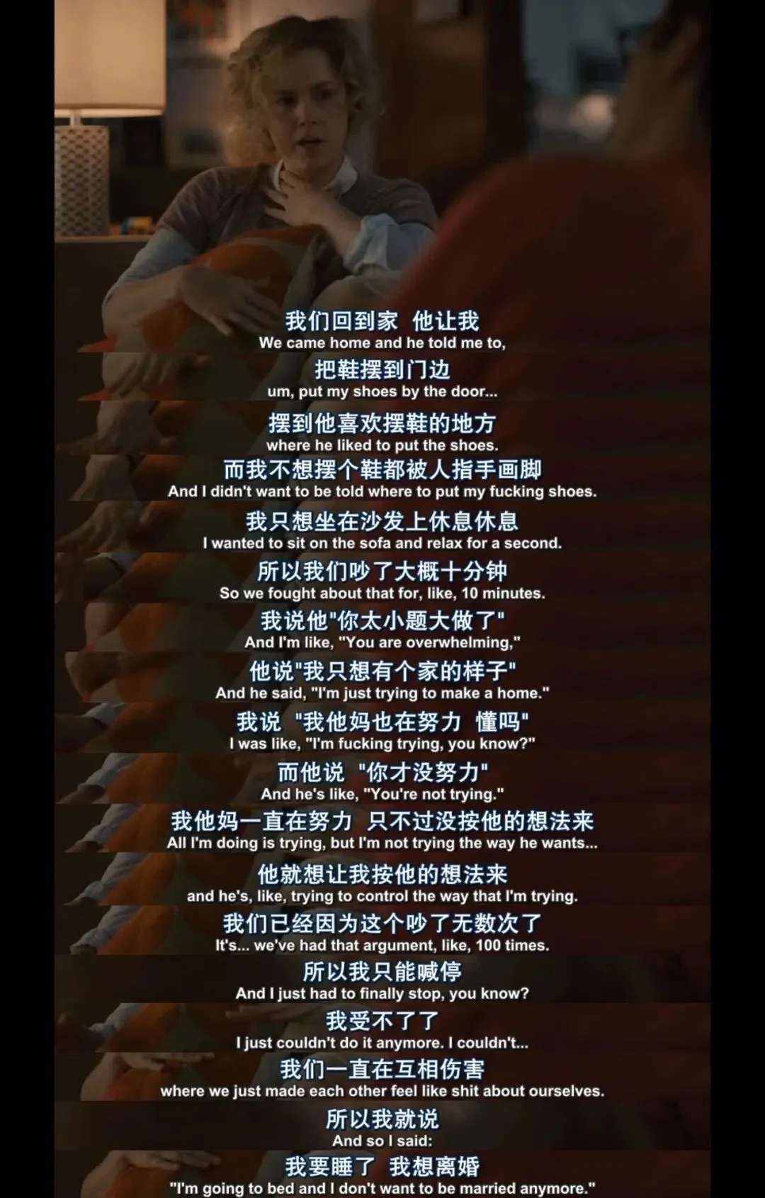 “我觉得你总希望我变成一个快乐开朗乐观阳光的妻子,”前妻在离婚时说,“可我就不是那种人。”