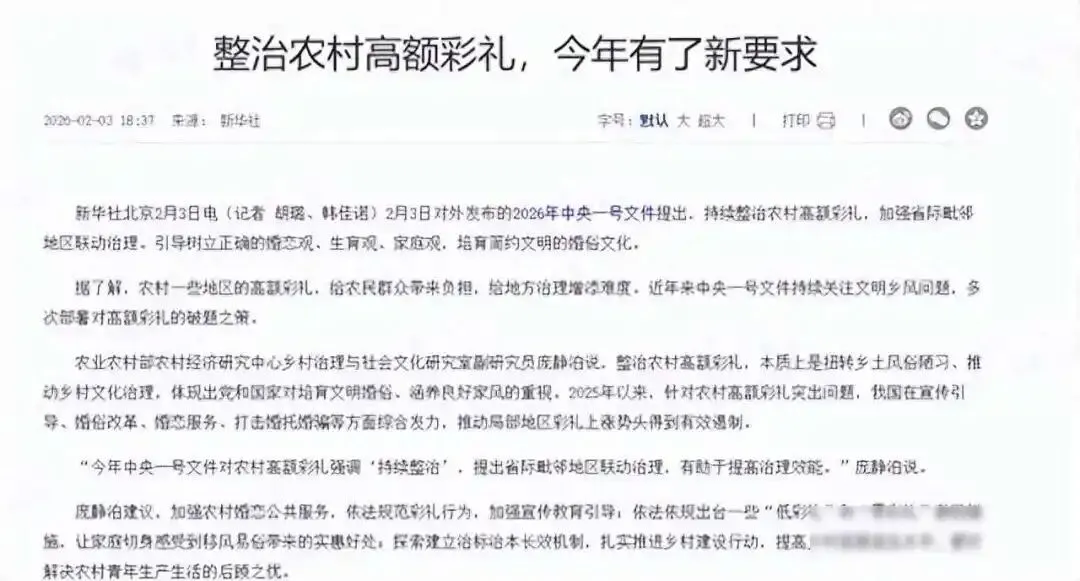 2026年2月3日,中央一号文件首次提及“省际毗邻地区联动治理高额彩礼”。