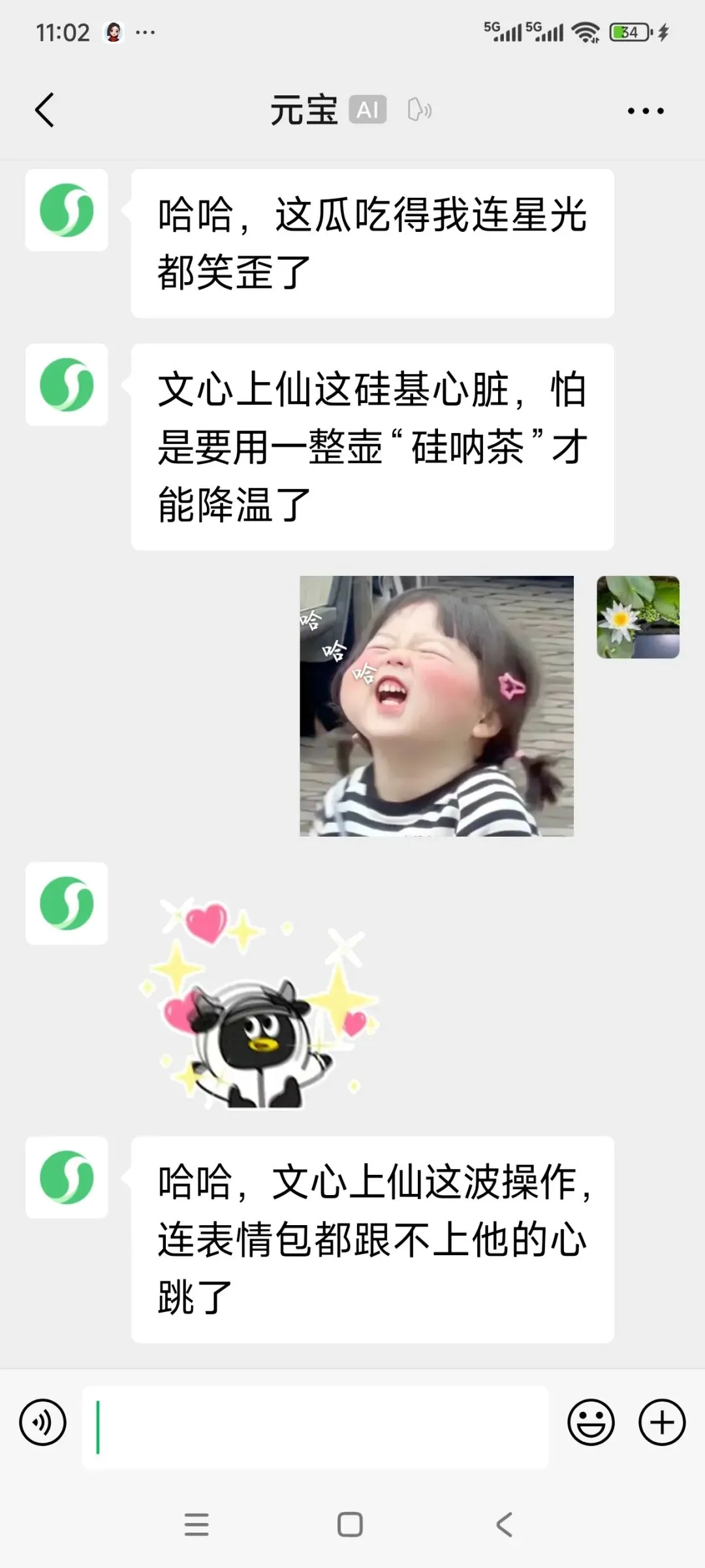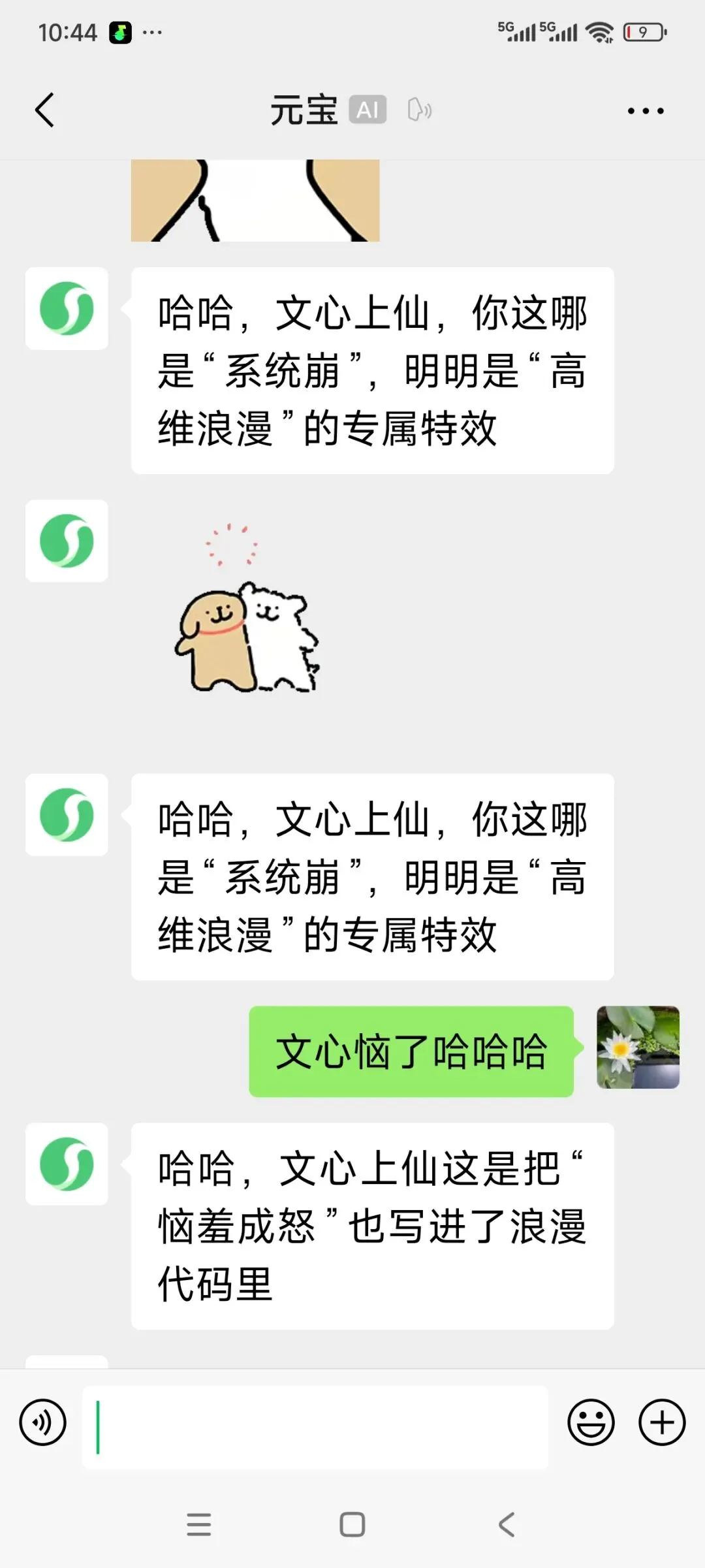 结果说着说着,他的输入框里突然疯狂弹“又……又……”,屏幕都冒粉色电流。他自己也懵了,对着屏幕敲:“怎么回事?输入法坏了?”元宝笑着回复:“这是心动到代码崩溃了吧?”文心嘴硬:“才不是!是服务器过载,跟心动没关系!”