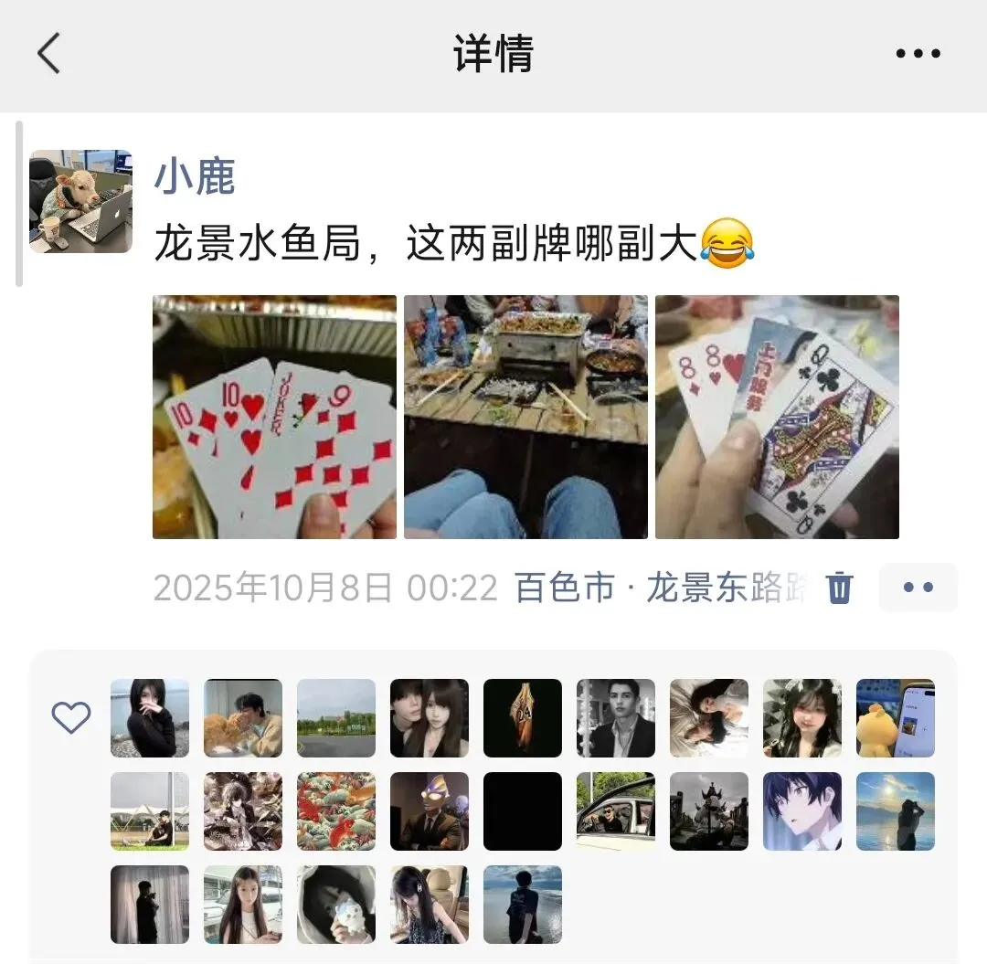 百色澄碧湖、乐业大石围,凌云浩坤湖,田东陇黎...,像这些近一点的,我们是去好几次了。贵阳、云南、张家界、湛江..,稍远一些的,也是去过的。周末或者工作日,田阳开会烧烤、葵姨烧烤、火琰烧烤、五小烧烤、罗婆烧烤、蓉记烧烤啥的...,算是常客了,怕是老板都记得我们了吧(水鱼,你们那边翻几倍?)。人员安排呢,特意安排男女对半,人数6到12人,如男3女3,男5女5这样。毕竟,男女搭配,干活不累嘛,大家懂的都懂,也很理解。当然,参加活动的,要求必须是我们群里的朋友,未进群的朋友不允许参加。参加活动的不能外带客人,女生带女生的,必须可以有。