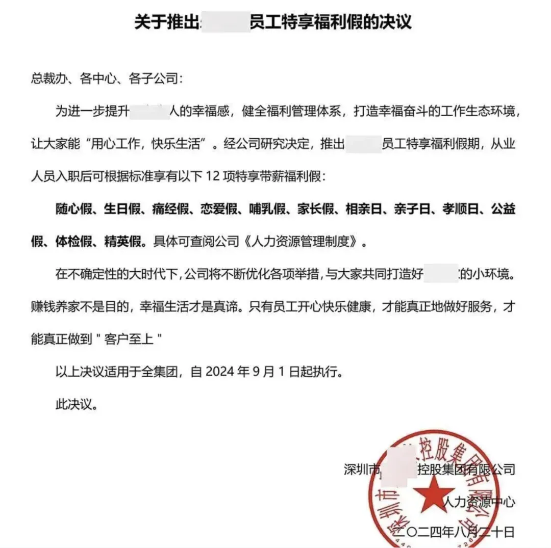 深圳一房地产中介公司宣布,自2024年9月1日起,为全体员工增设12项带薪特别假,包括每月2小时的“随心假”、纪念日可用的“恋爱假”、员工专属“生日假”、表彰杰出者的“精英假”等,符合条件者最多可额外带薪休假16天。